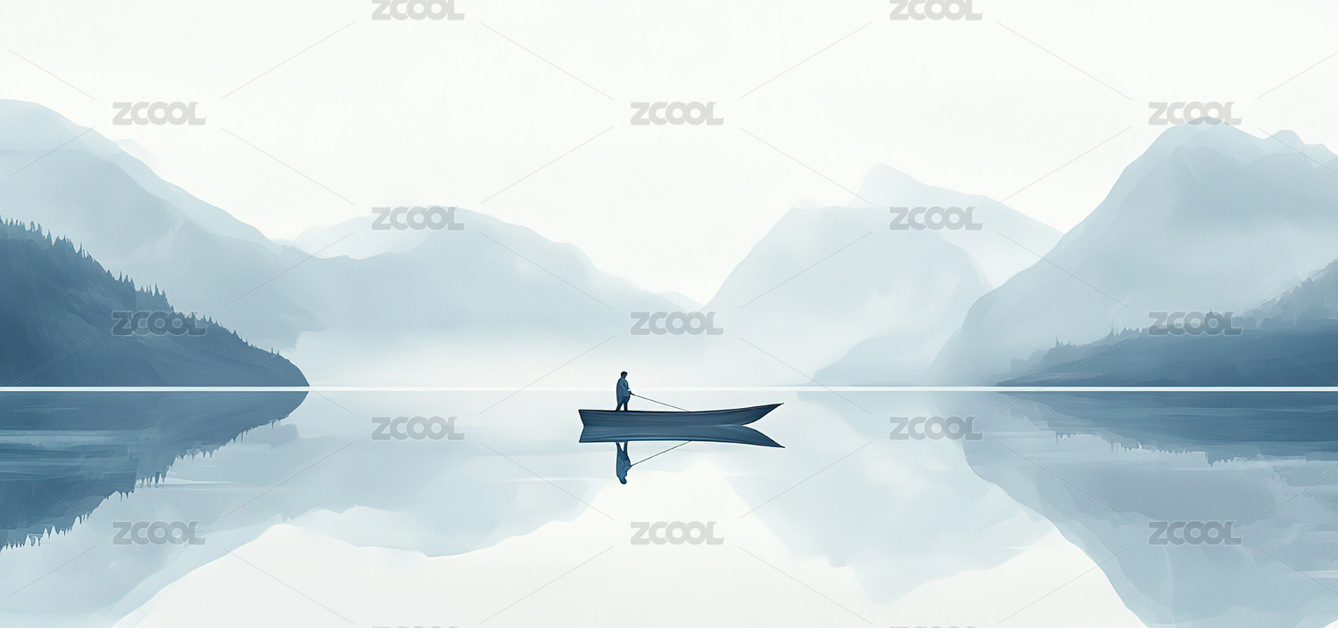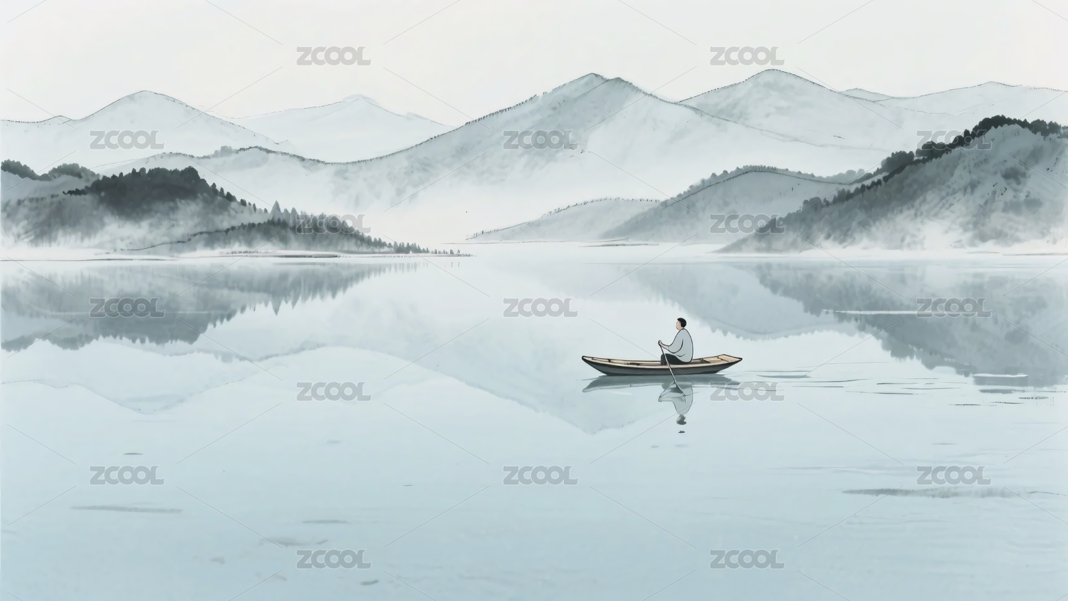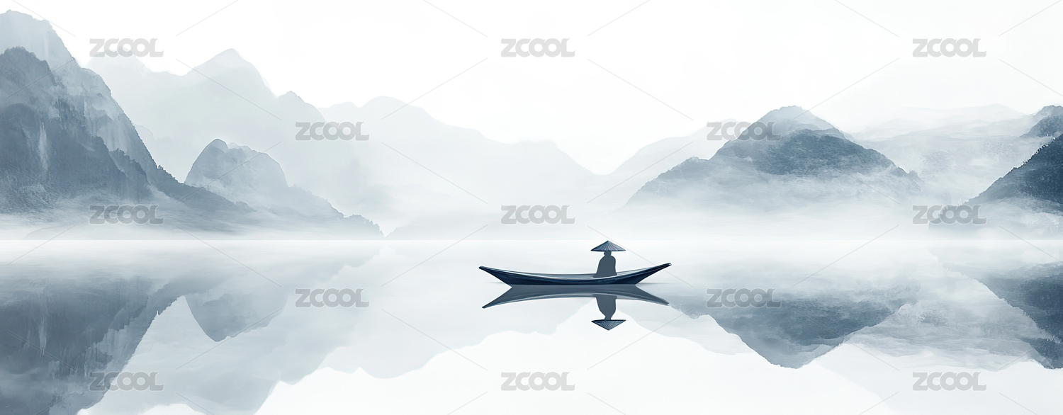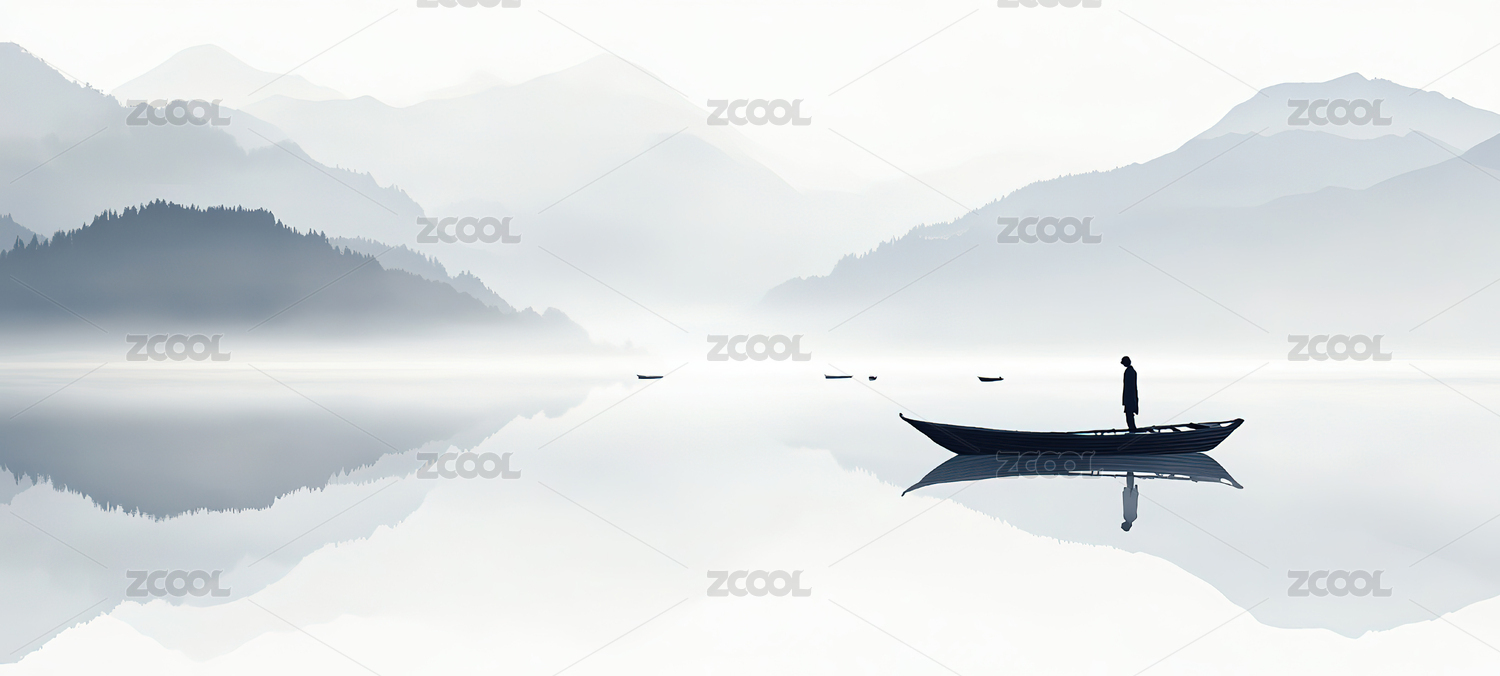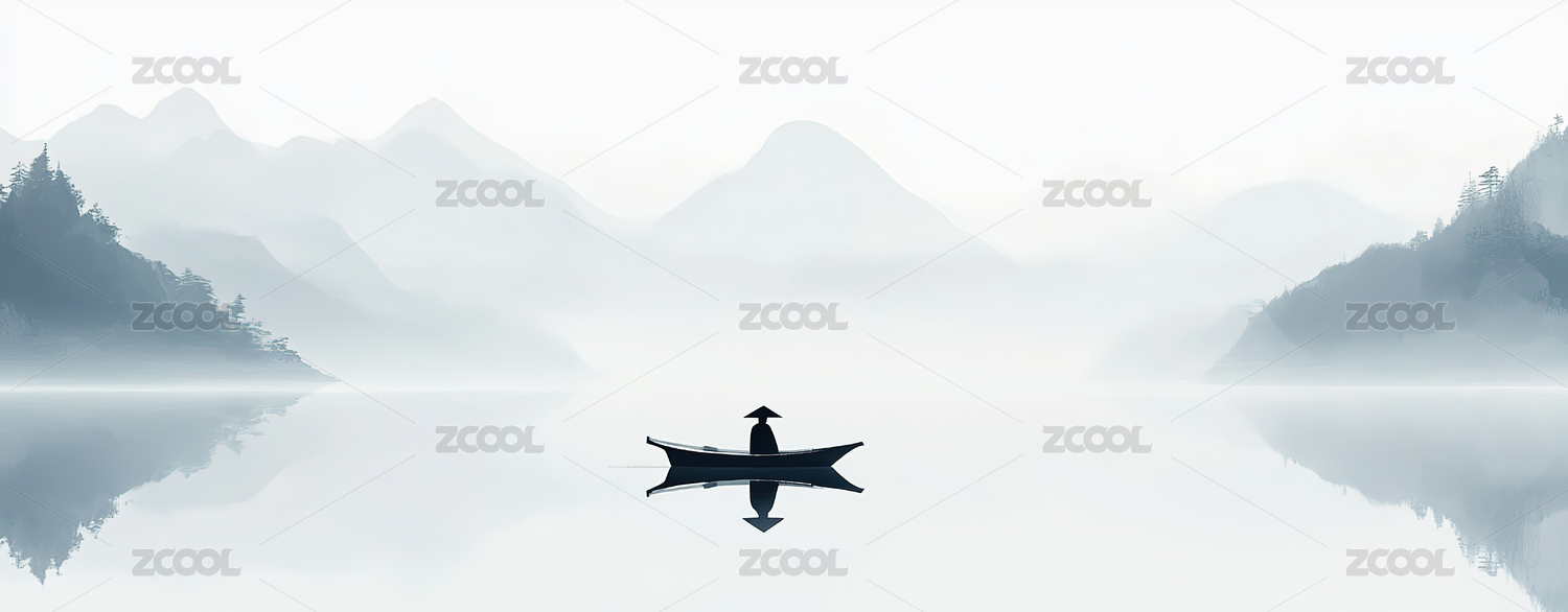 小船,山水,雾气,独钓,自然,意境,水墨画,插画,矢量,风景