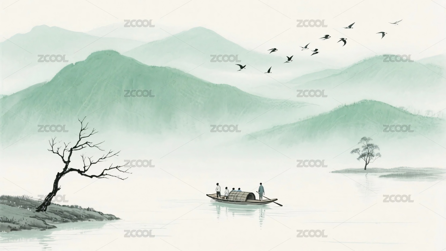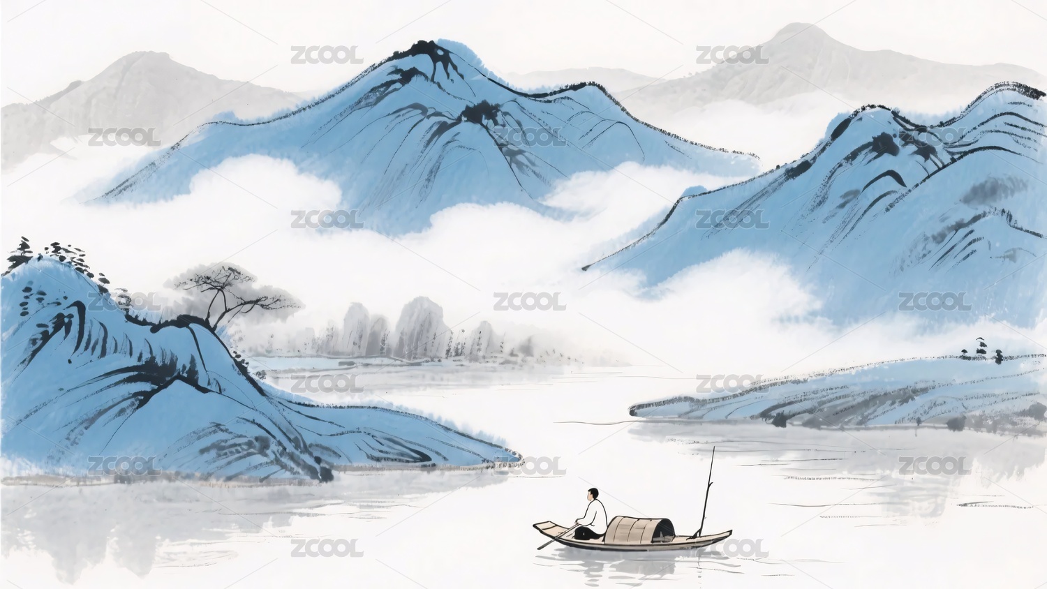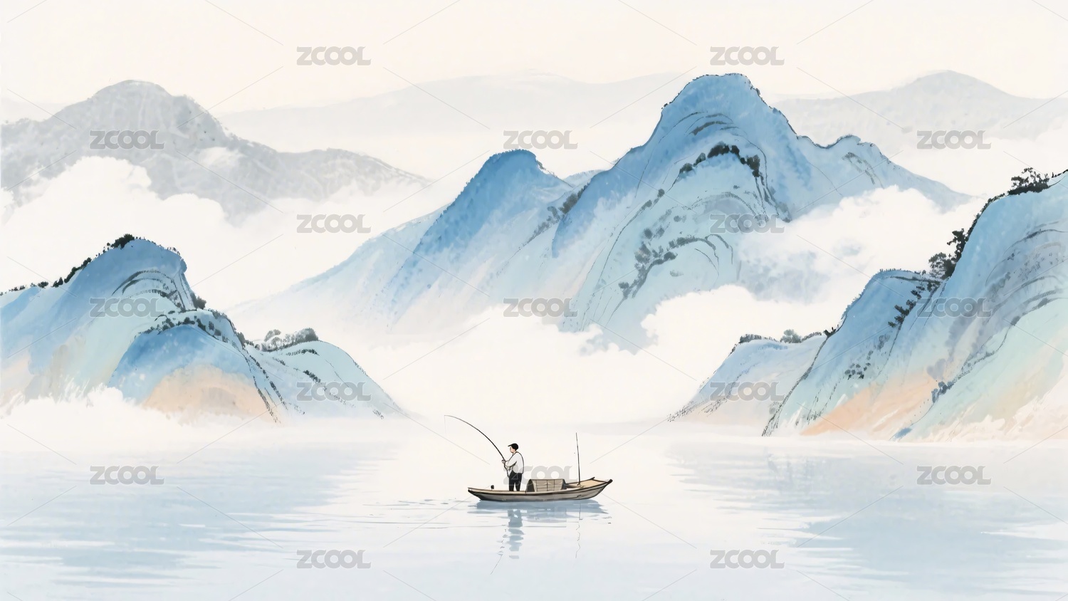 山水,小舟,垂钓者,水墨画,插画,矢量,中式,意境,自然,宁静