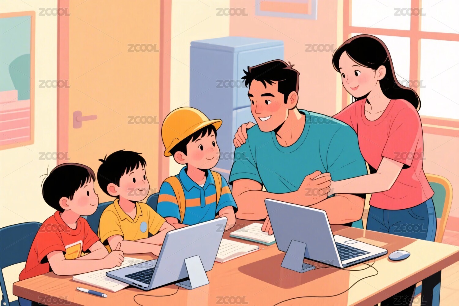 师生群体卡通幼教互动场景