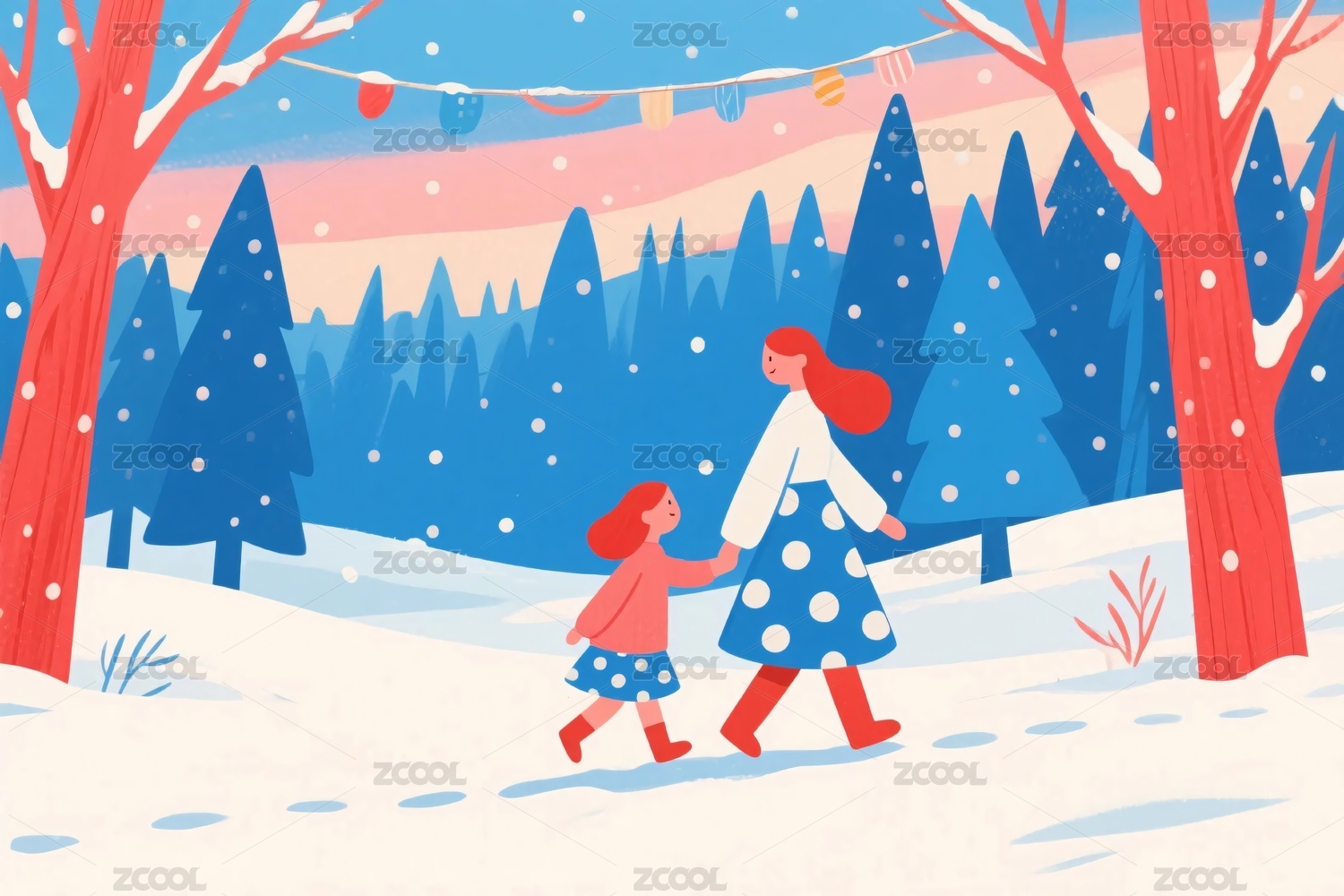 雪地,母女,冬装,灯笼,树林,雪花,冬日,插画,插画画风,矢量图