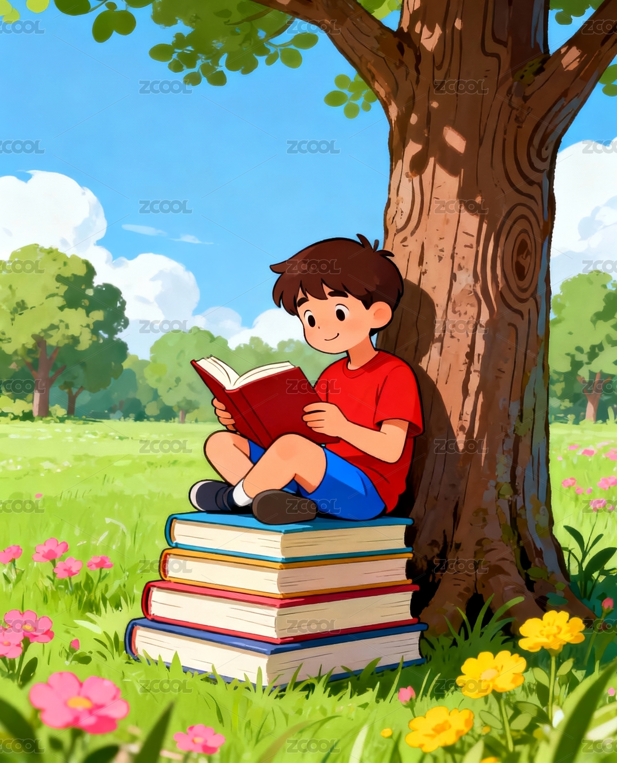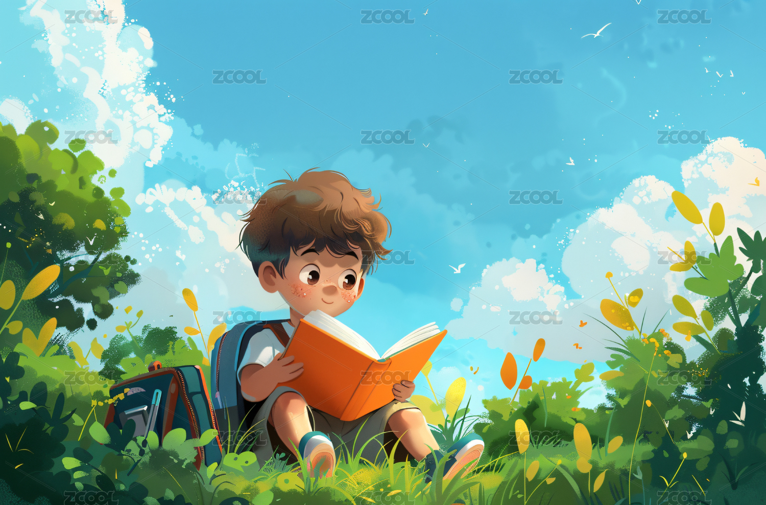 男孩惬意户外阅读场景