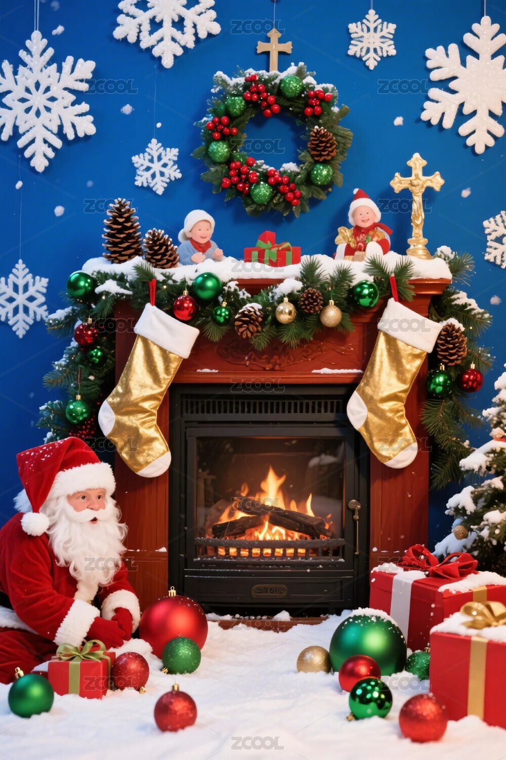 圣诞树,圣诞老人,玩偶,壁炉,雪花,礼物,饼干,装饰,花环,彩灯