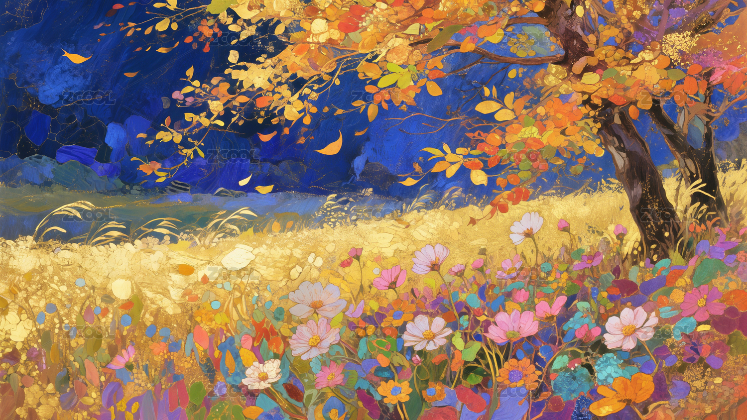 樱花树,森林,草地,春景,蓝天,花草,自然,风景,插画,绘画