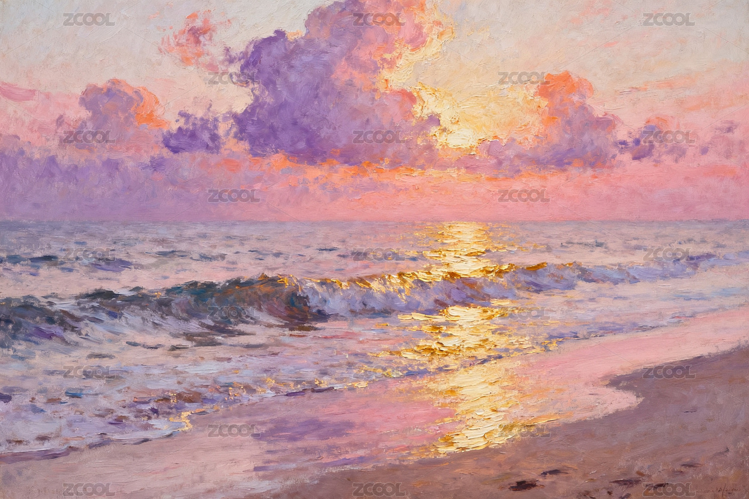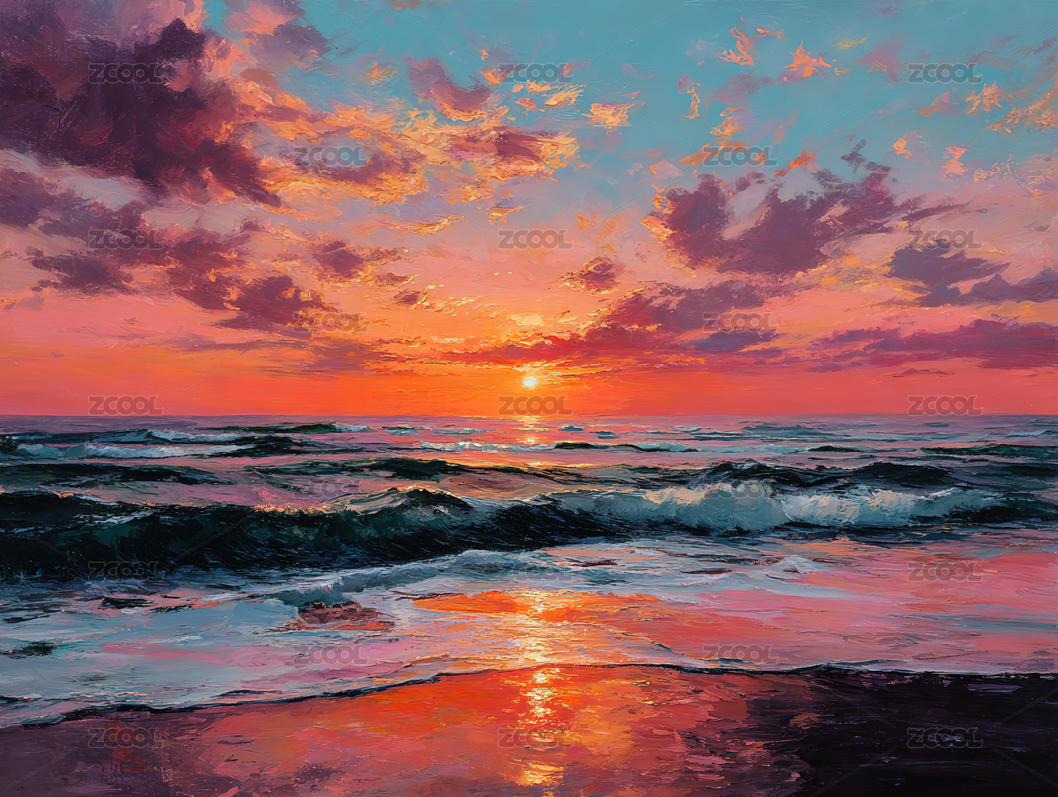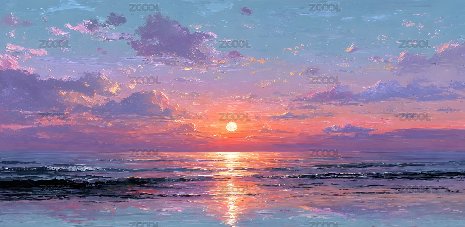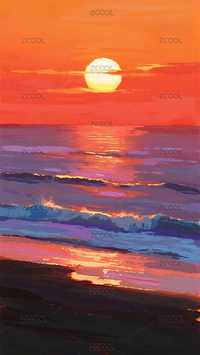 海滩,日落,海洋,沙滩,天空,太阳,风景,风景画,插画,油画