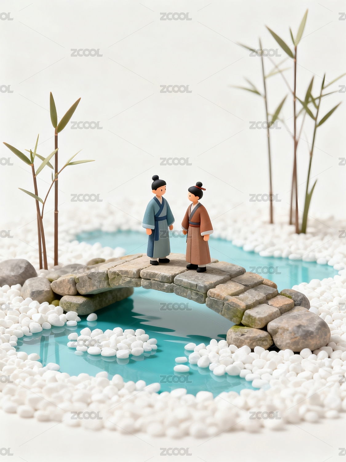 桥上人物竹林相遇