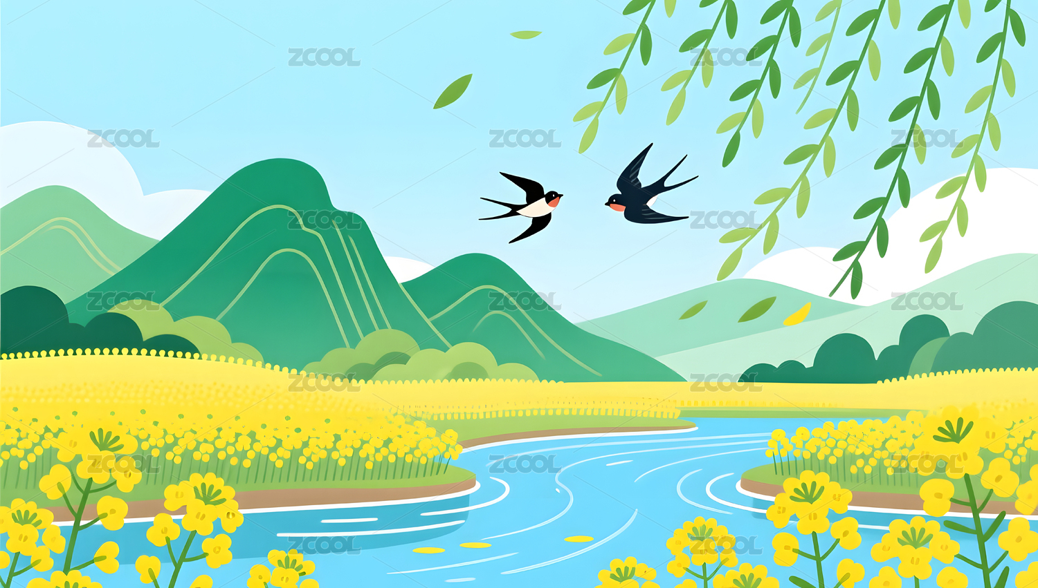 燕子,山水,河流,柳树,房屋,远山,自然,风景,春天,插画