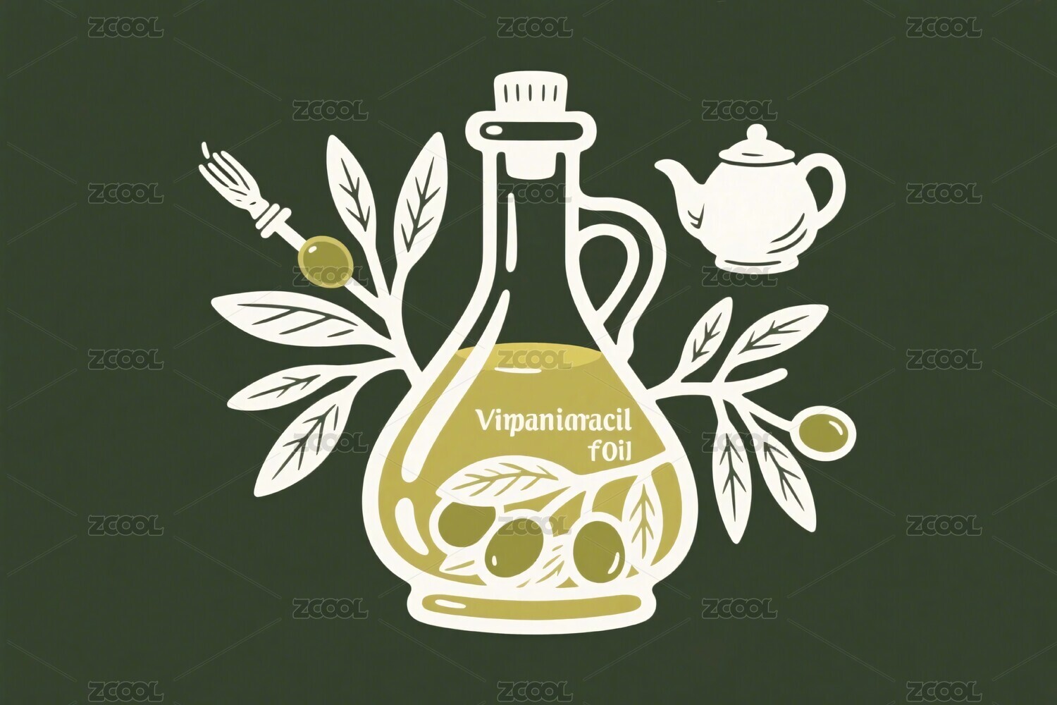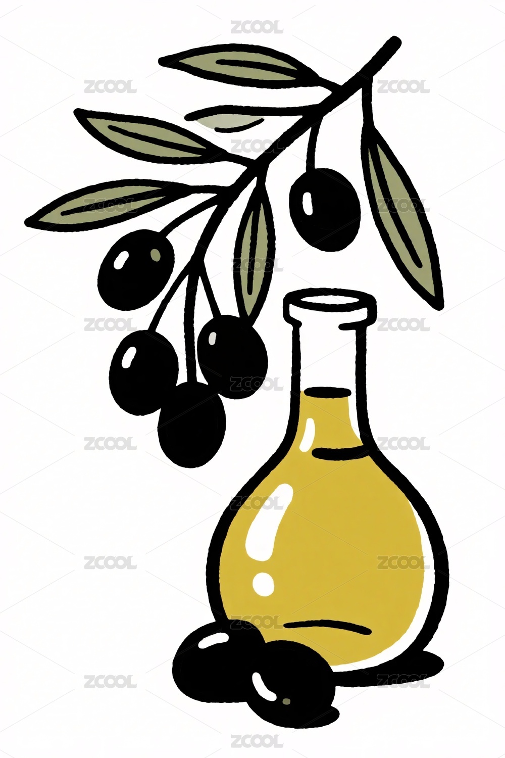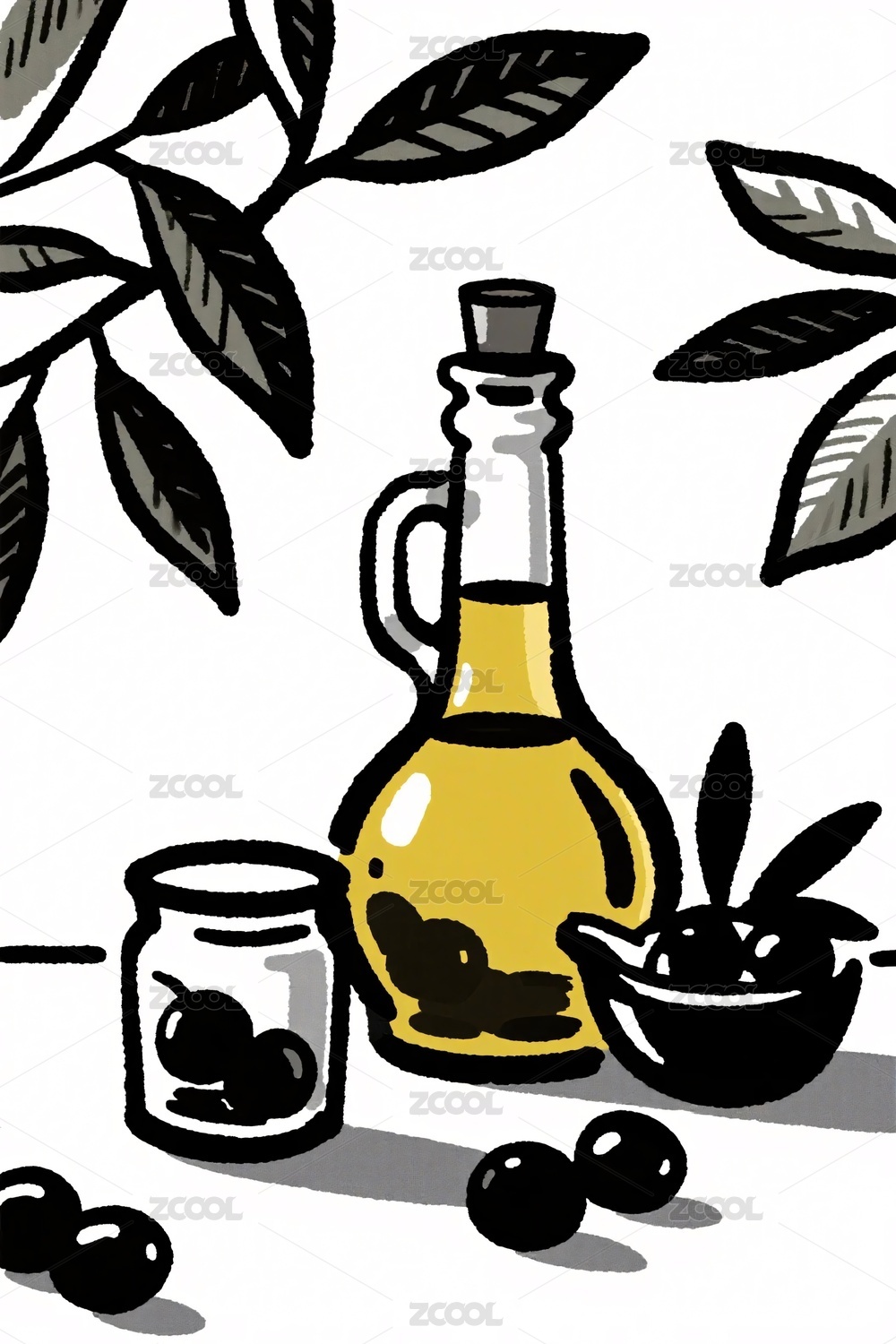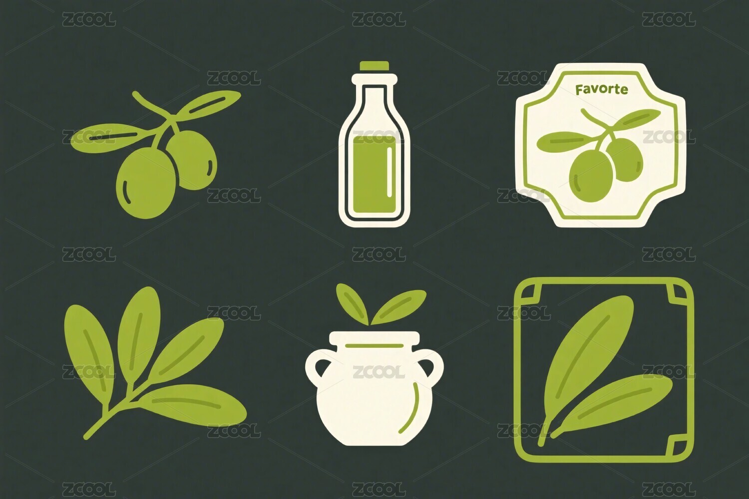 插画,橄榄枝,橄榄油瓶,茶壶,橄榄,绿色背景,简约风格,矢量图,生活元素,美食相关