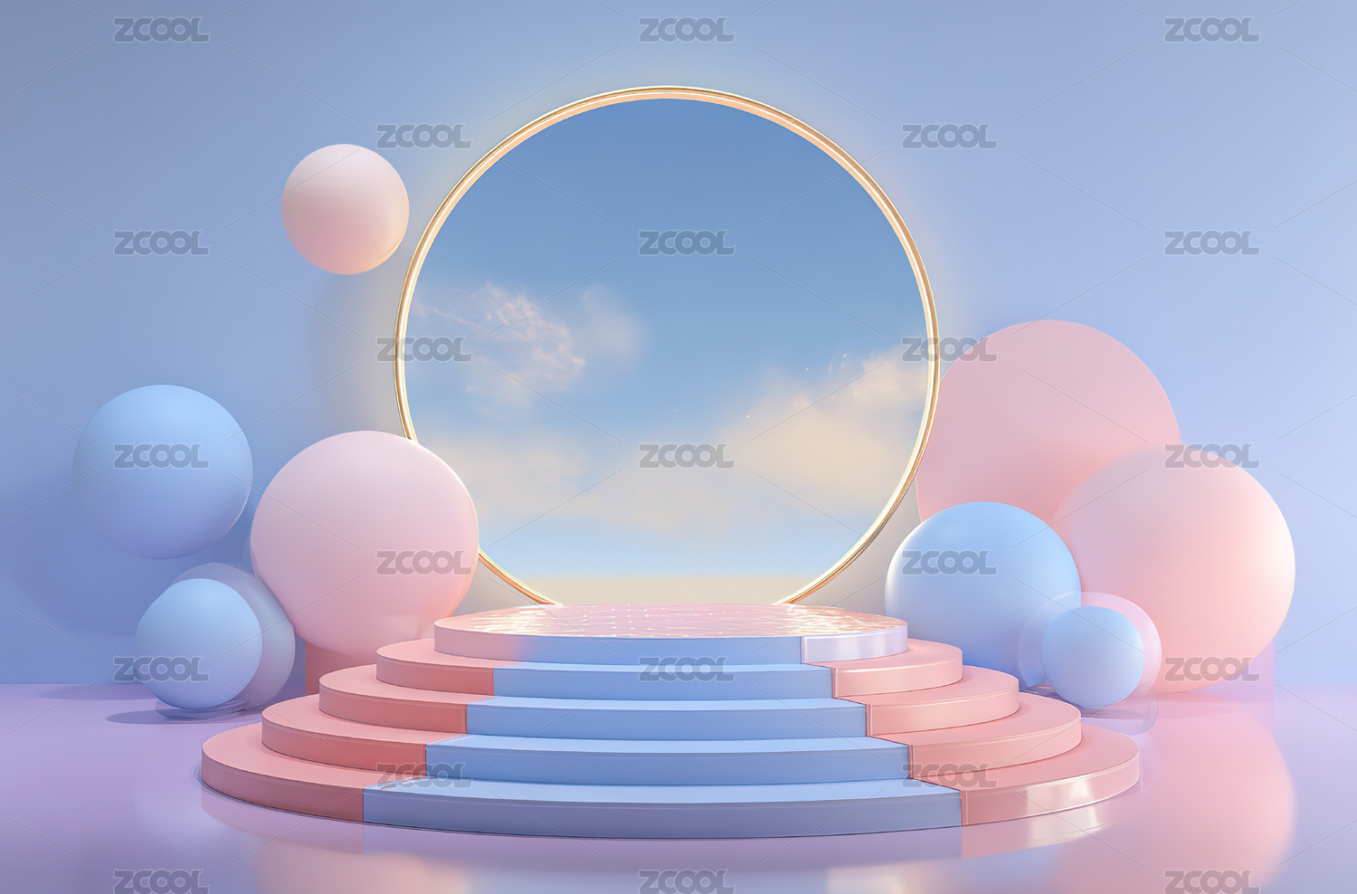 蓝色阶梯平台与圆形镜面