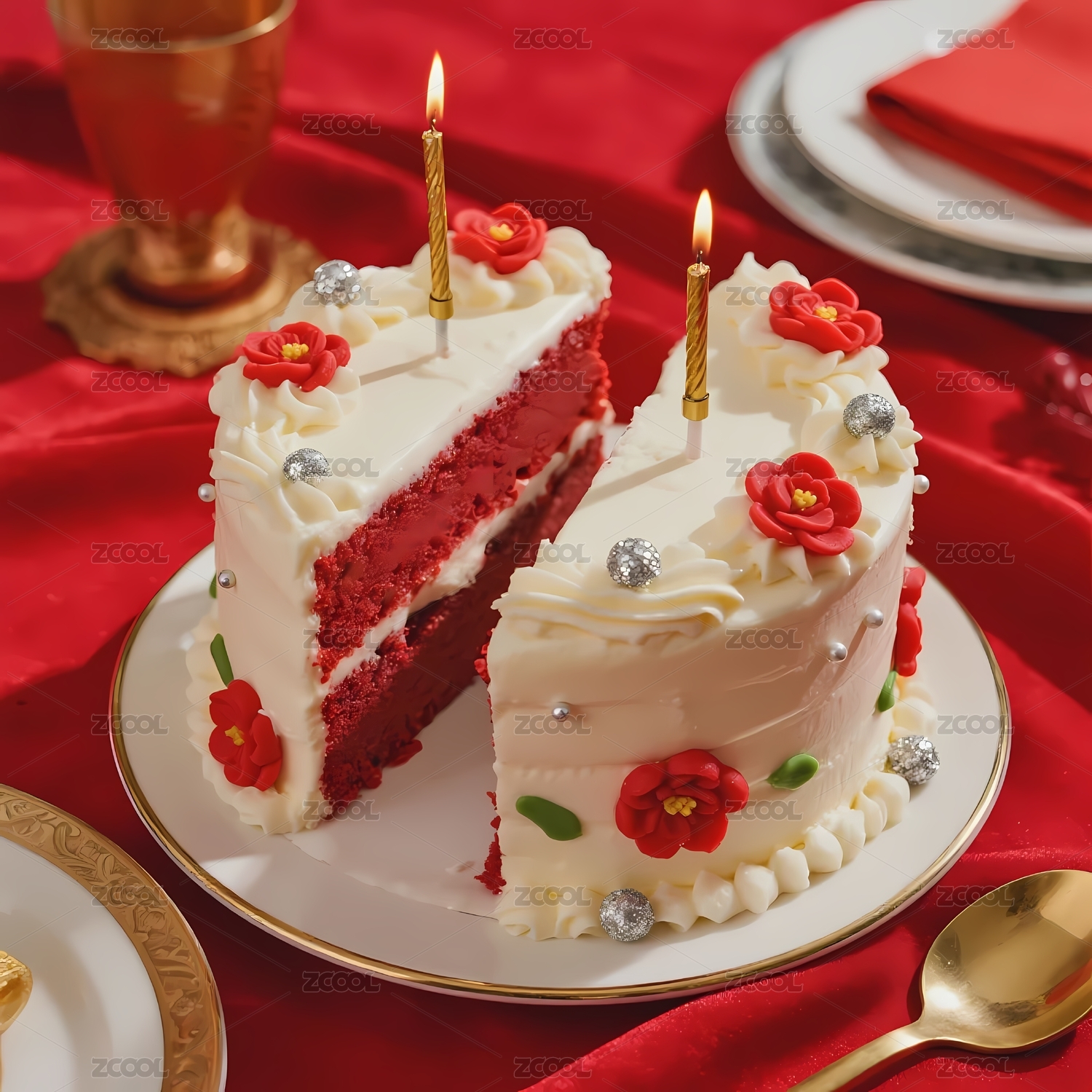 切开的红色天鹅绒蛋糕装饰有花朵和蜡烛