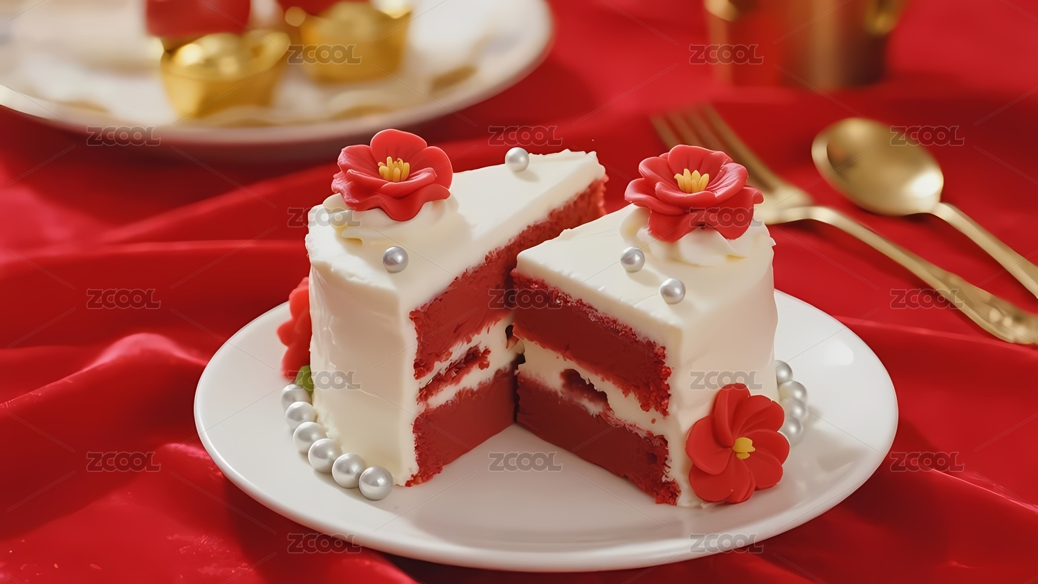 红丝绒蛋糕切片装饰花朵与珍珠