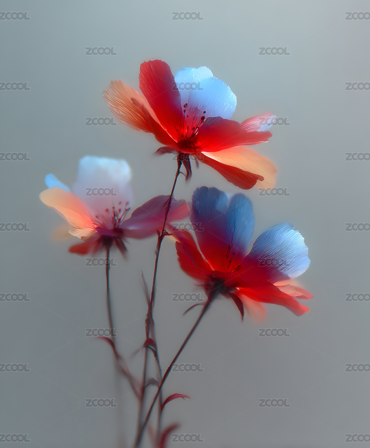 蓝红罂粟花绽放柔光氛围