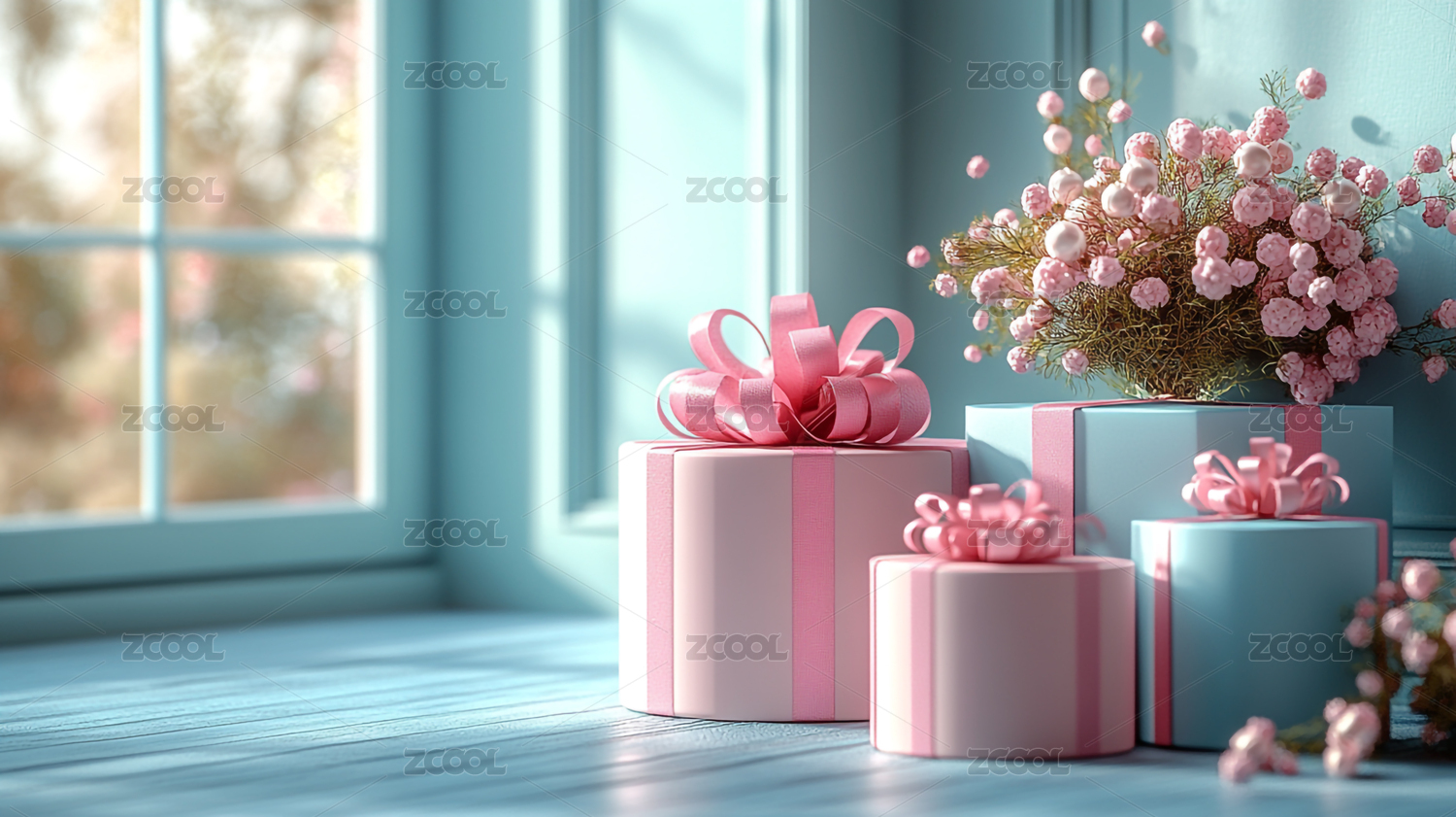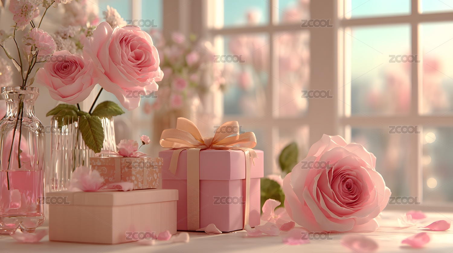 粉色礼物与玫瑰花 浪漫温馨窗边场景