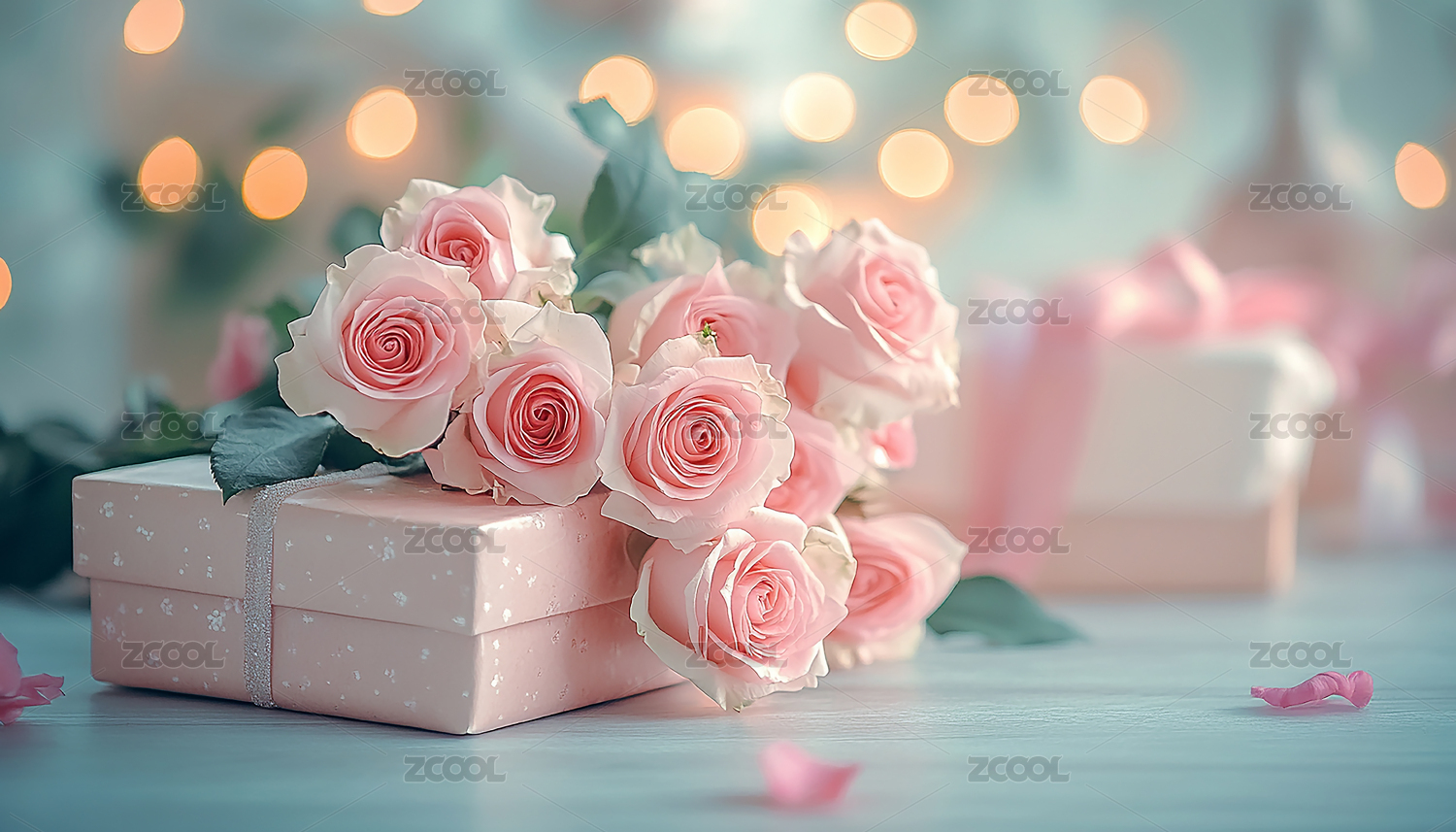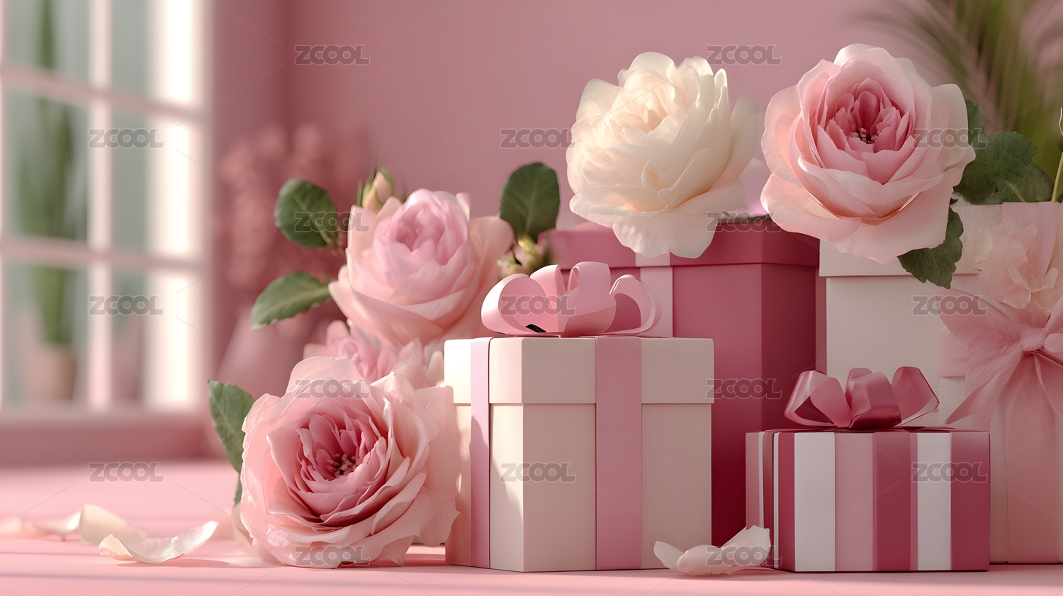 粉色礼盒与玫瑰花束 节日浪漫温馨场景