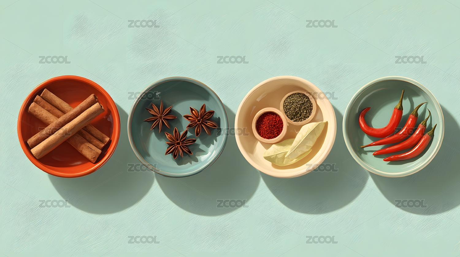 香料拼盘陈列 清新美食氛围