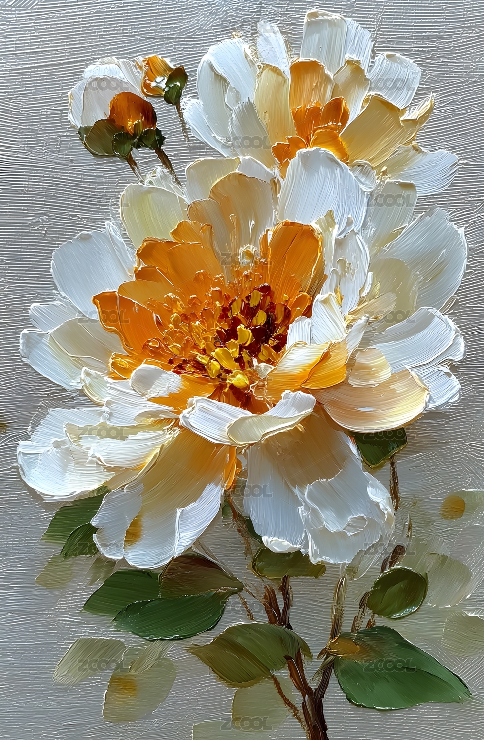 厚涂油画中的盛开花朵与绿叶