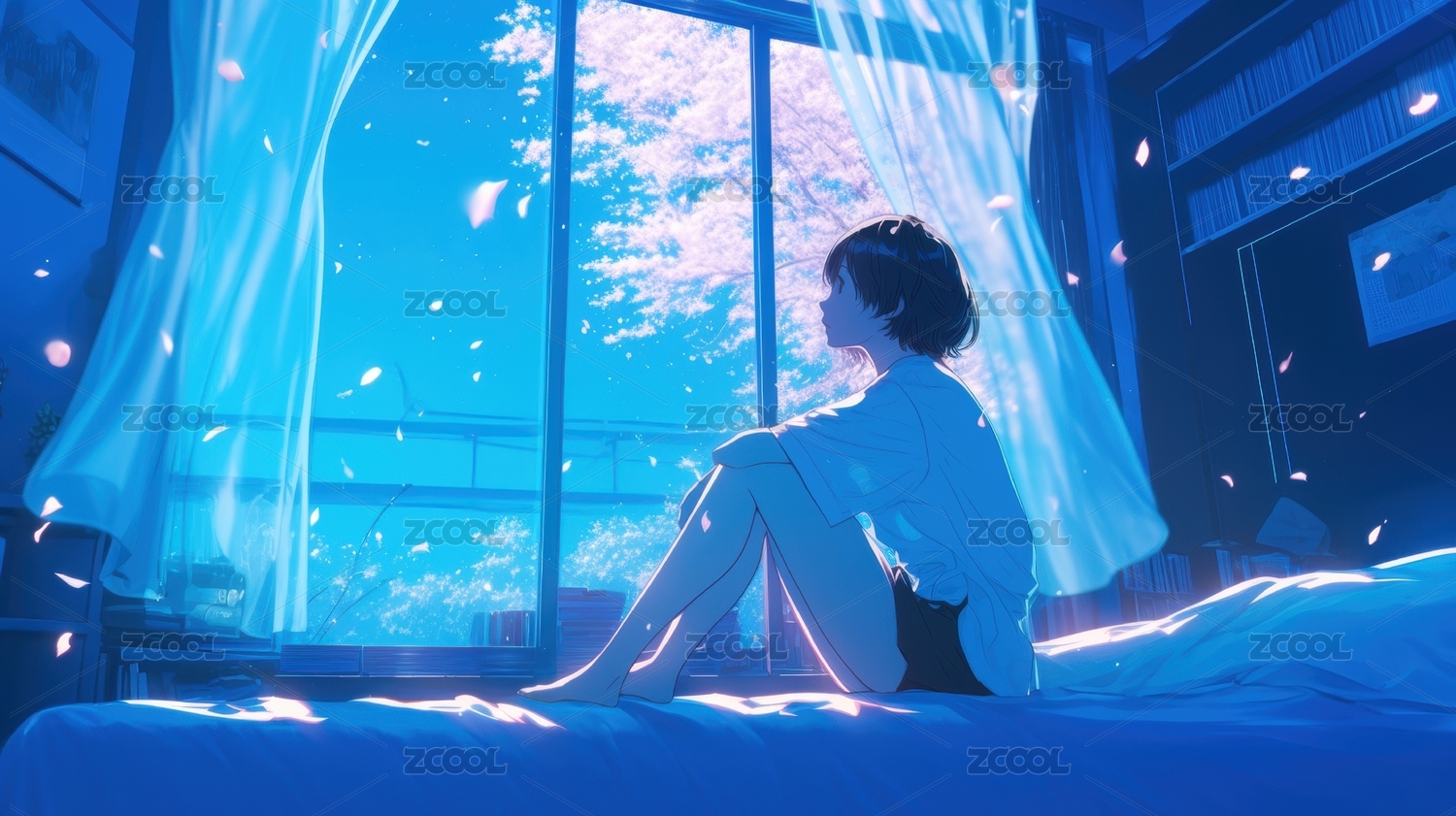 窗边少女樱花飘落的梦幻瞬间