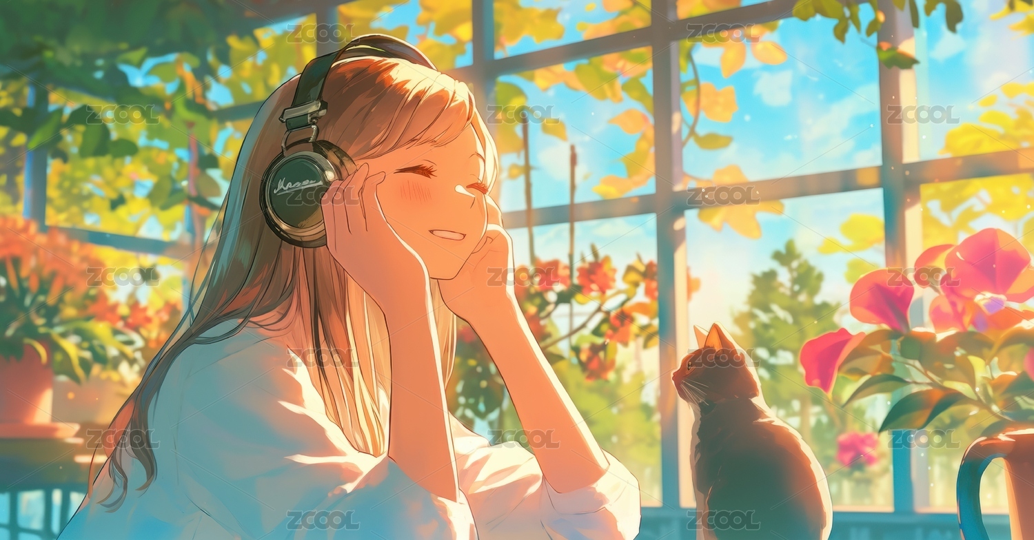 戴耳机的女孩与窗边猫咪