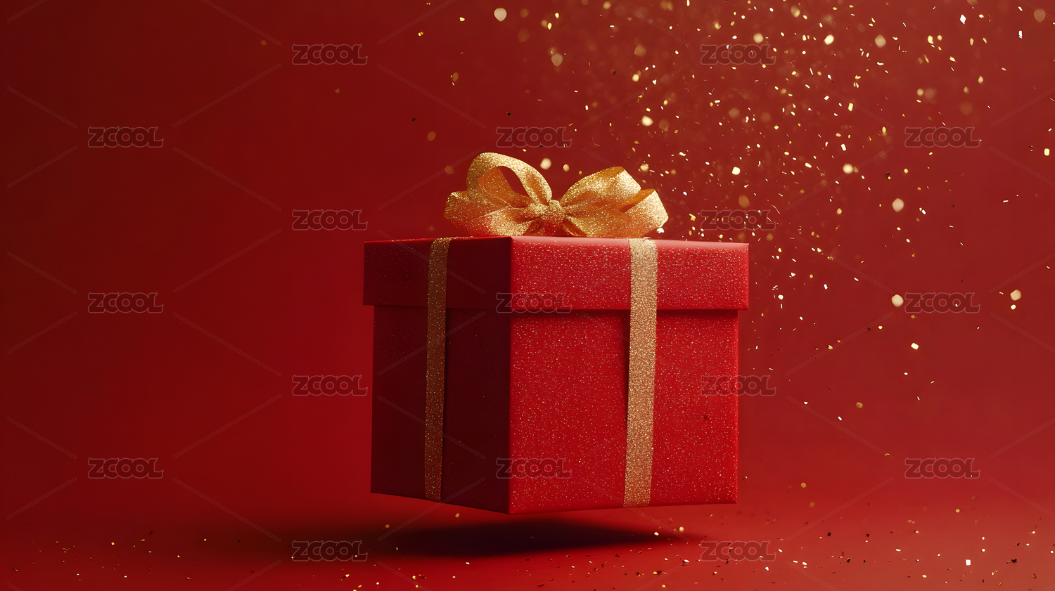 红色礼盒配红蝴蝶结,背景点缀闪光。