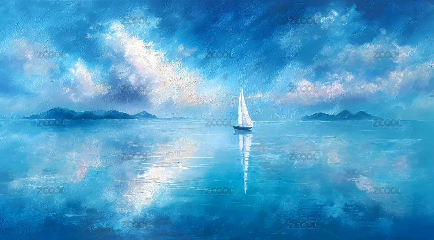 油画风格海面上一艘帆船