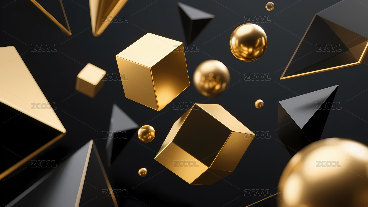 金色与黑色几何体的动态悬浮艺术