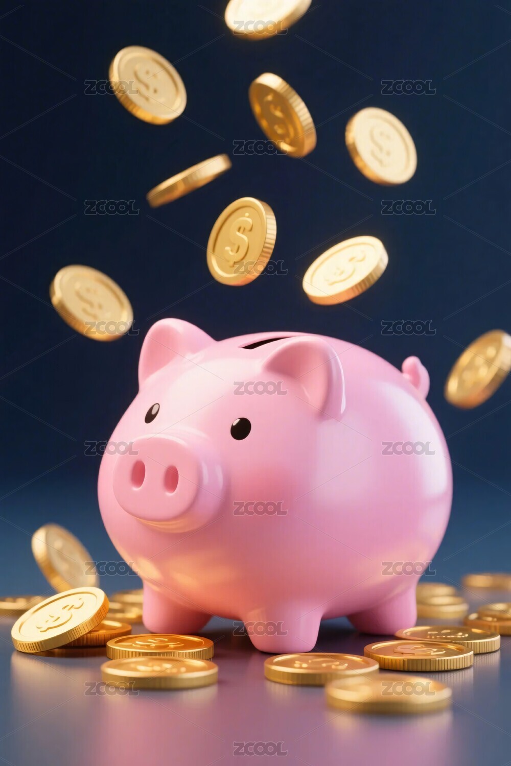 蓝色闪着金色光斑背景上的金币和小猪存钱罐