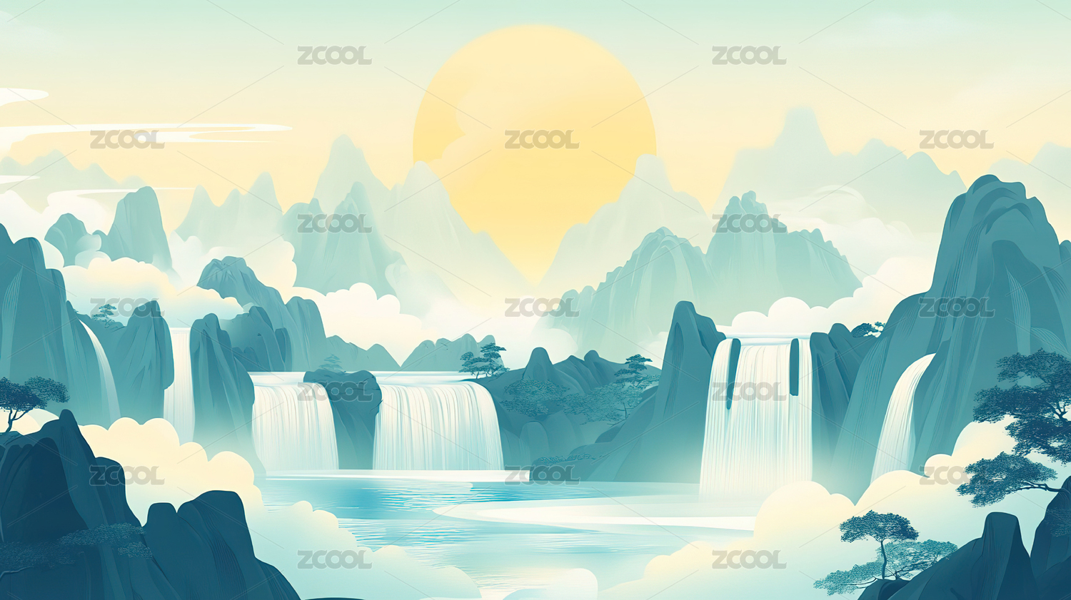 中国风插画高山瀑布流水