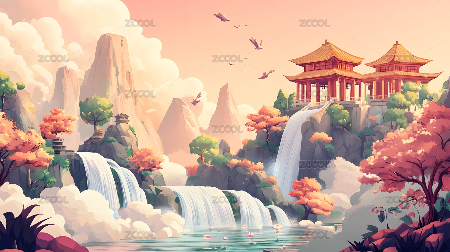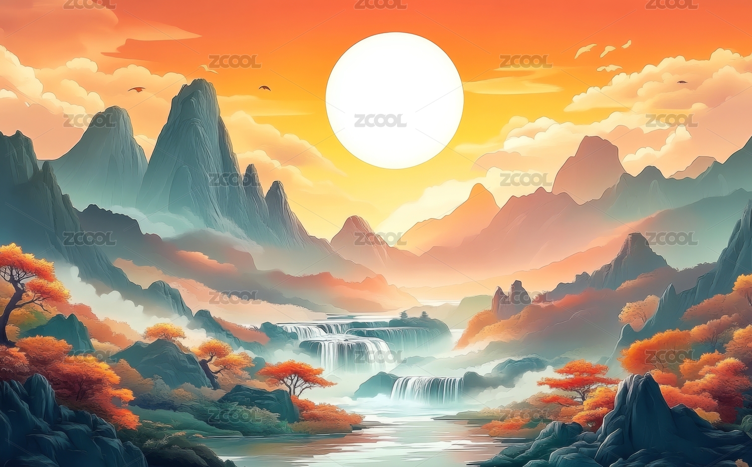 彩画中国画山水画国风国潮梦幻唯美AI数字