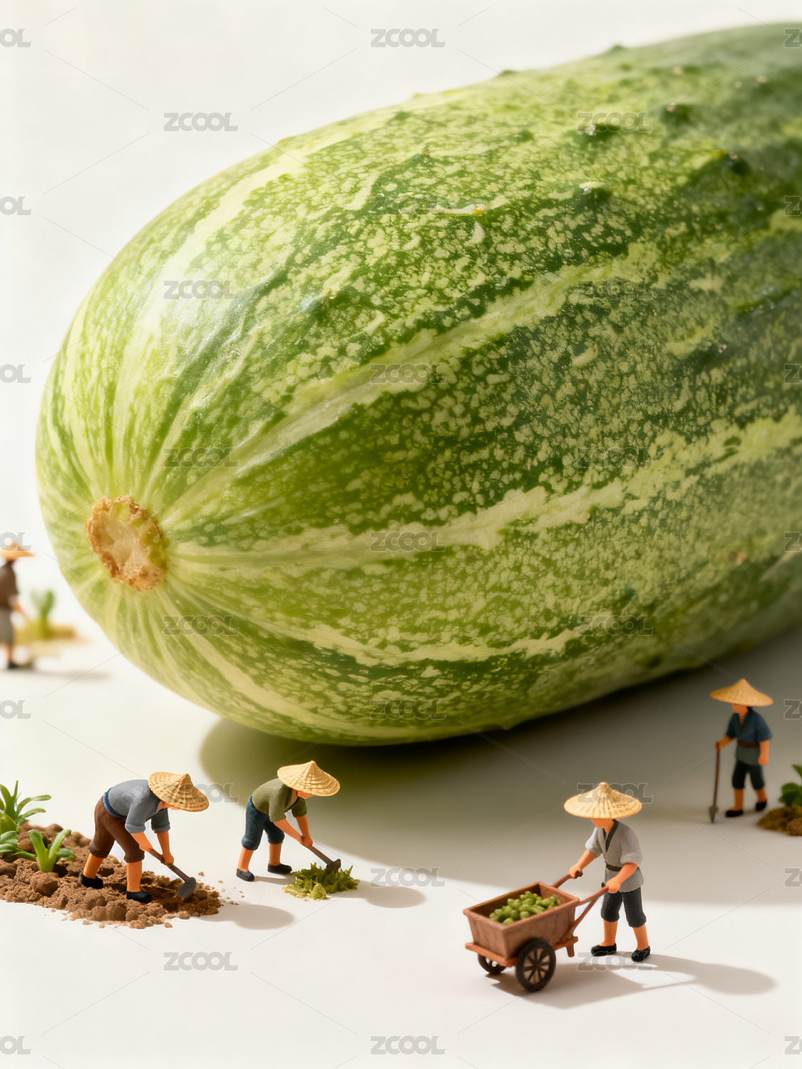 微型摄影 工人用梯子在巨大的黄瓜上工作