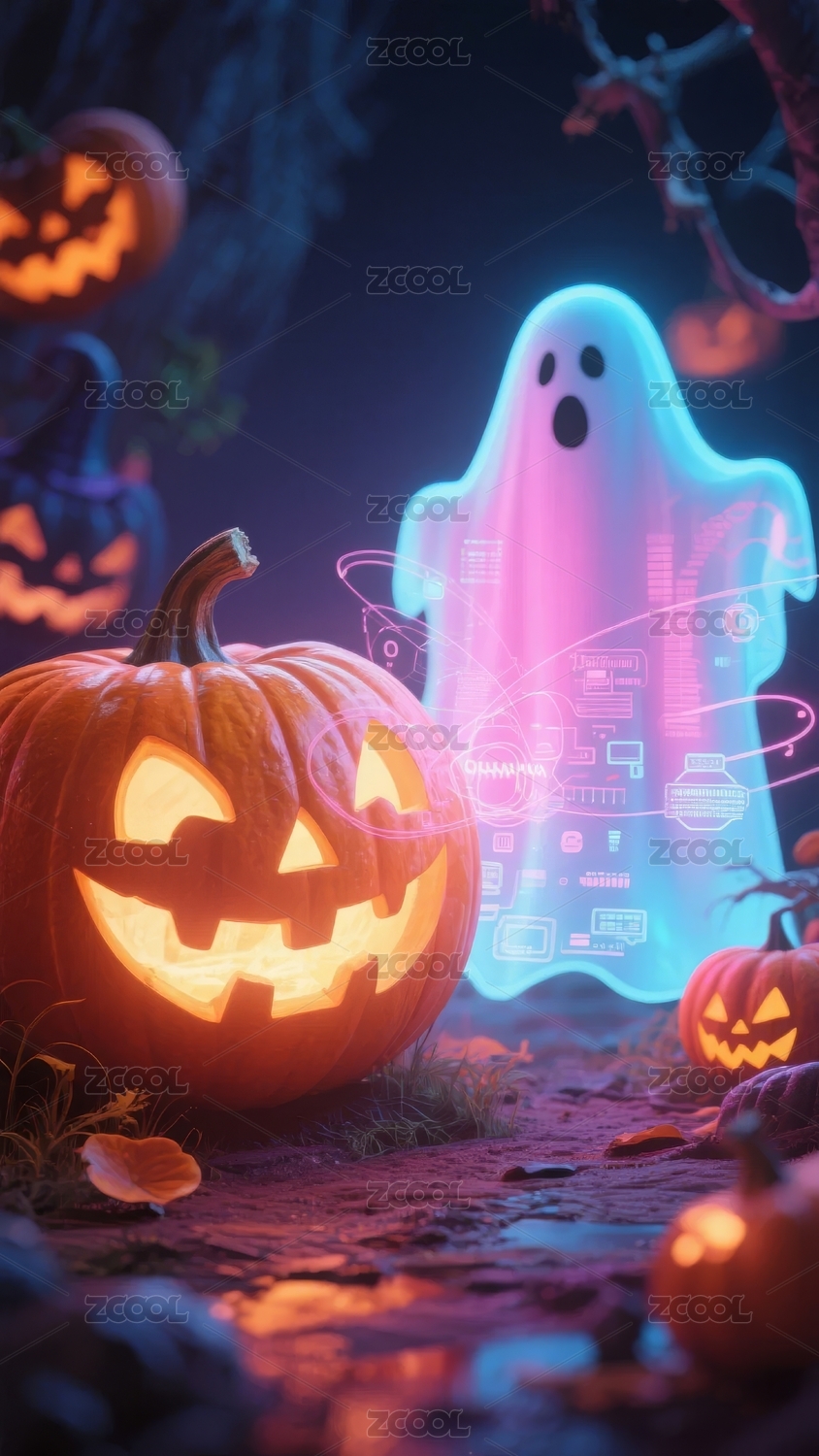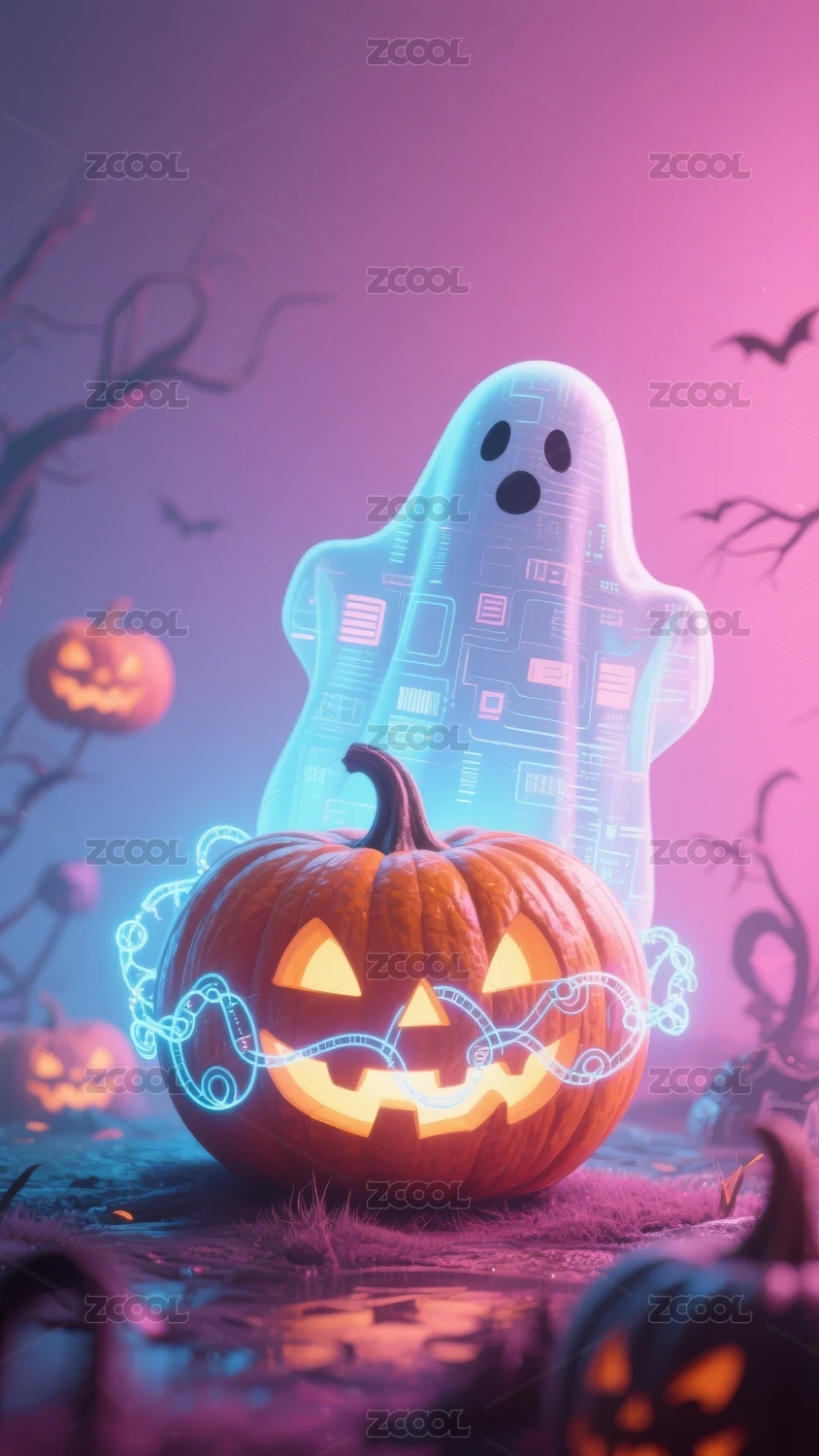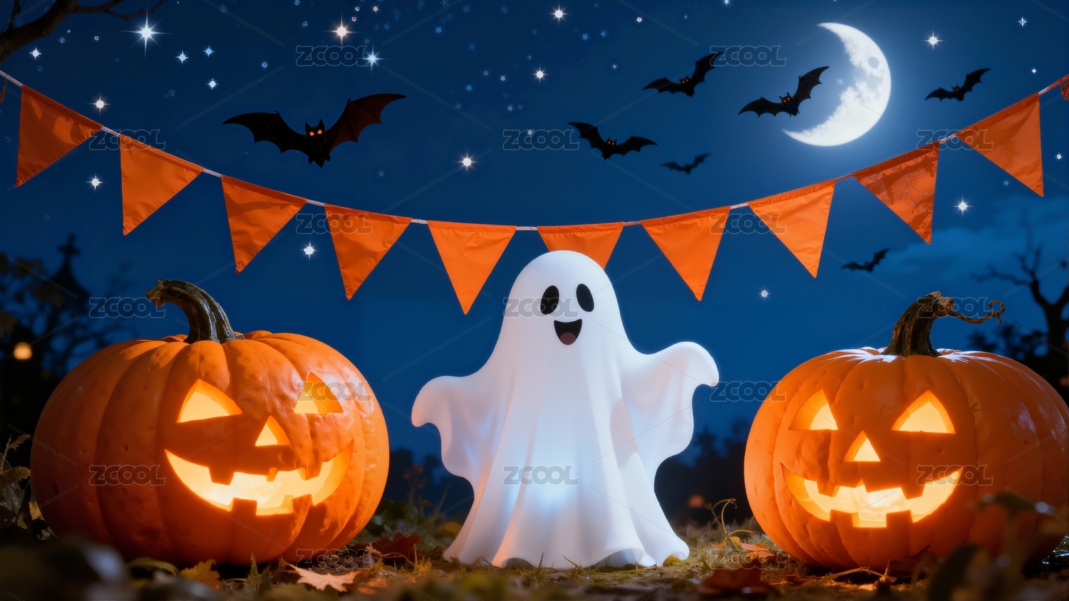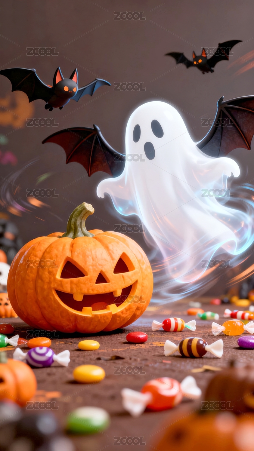 3D卡通可爱幽灵和南瓜蝙蝠的万圣节背景
