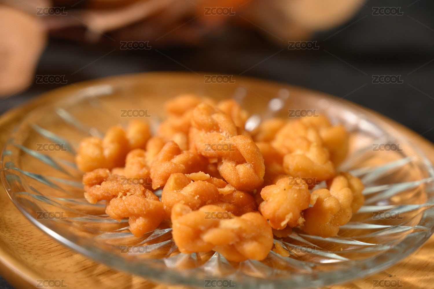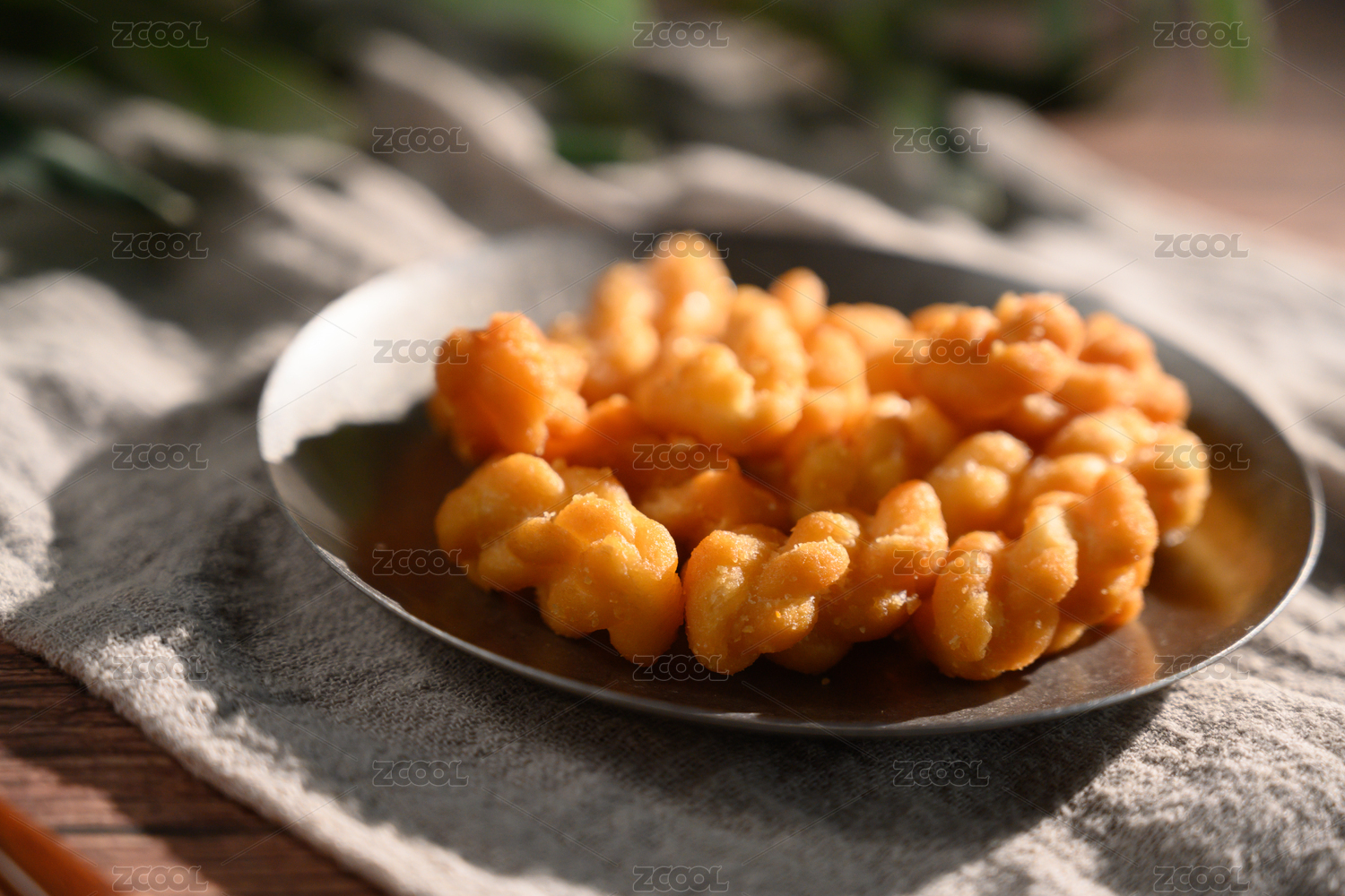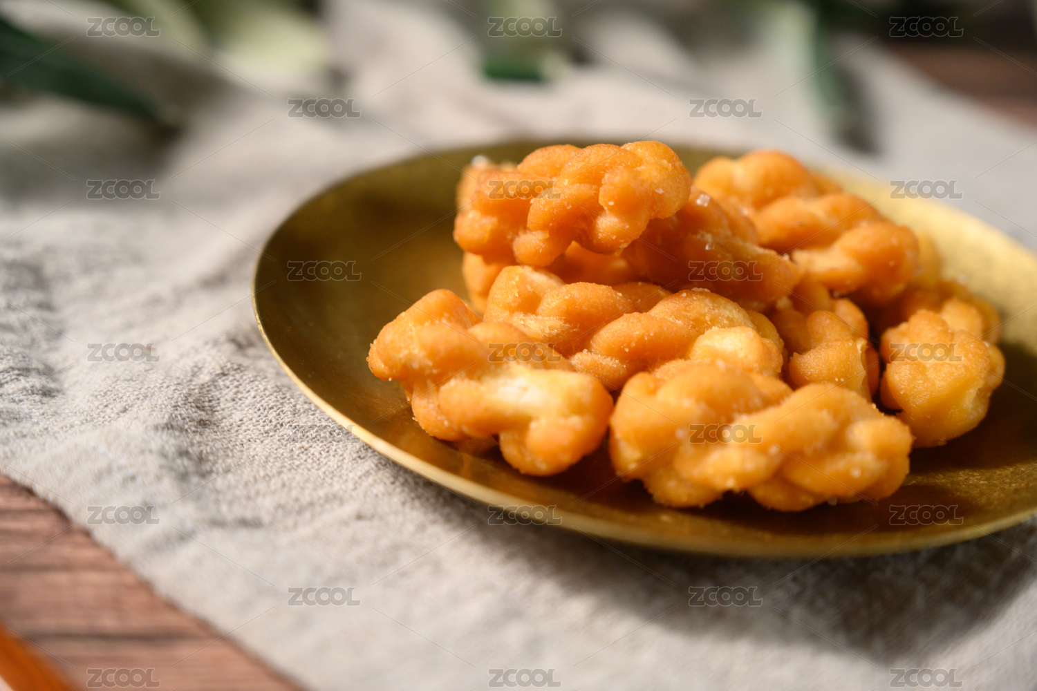桌面上的盘子里的美味可口的糖麻花