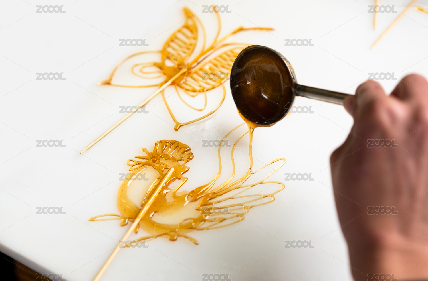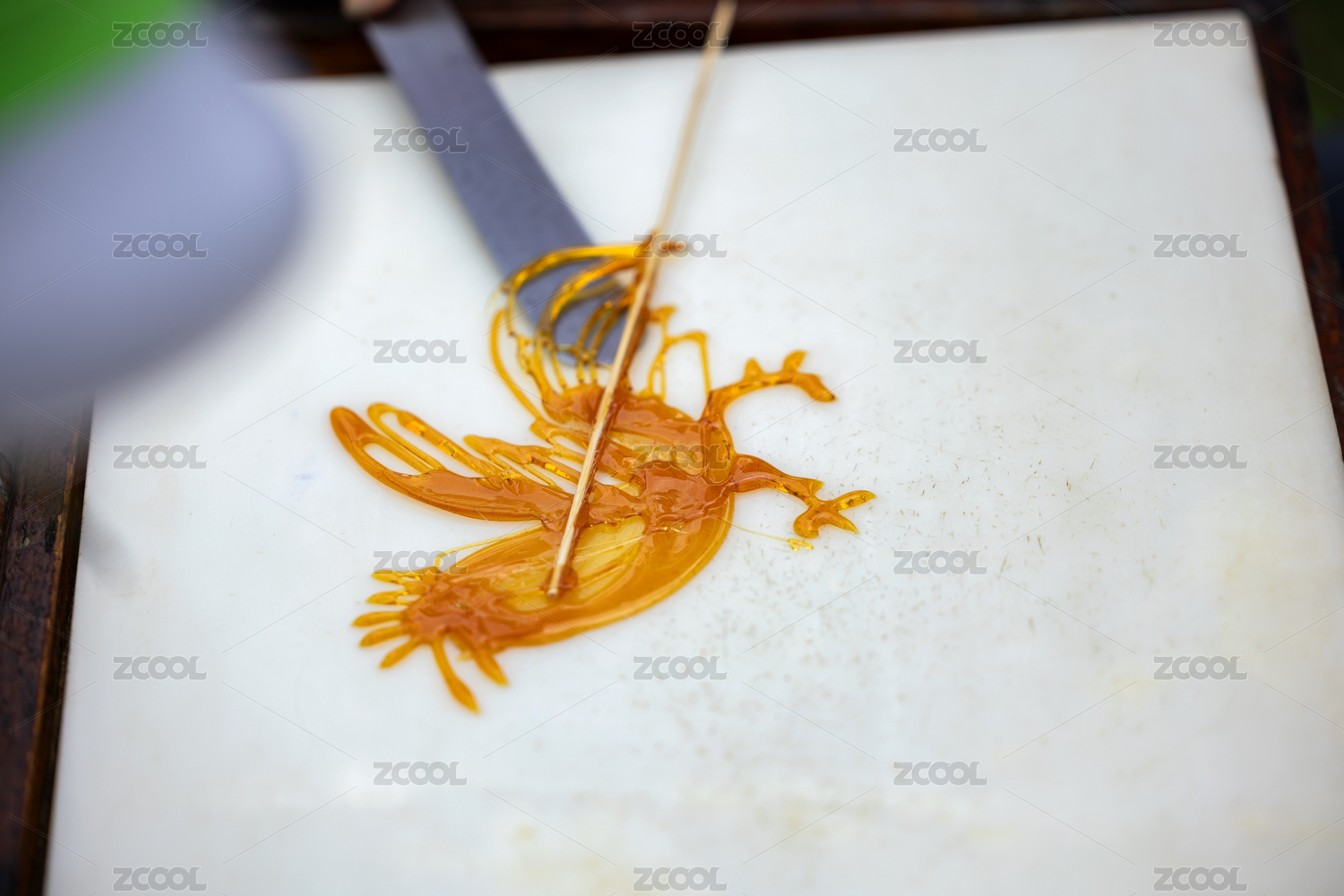 正在白色汉白玉石板上用铁勺乘黄色糖汁绘制的中国民间传统糖画