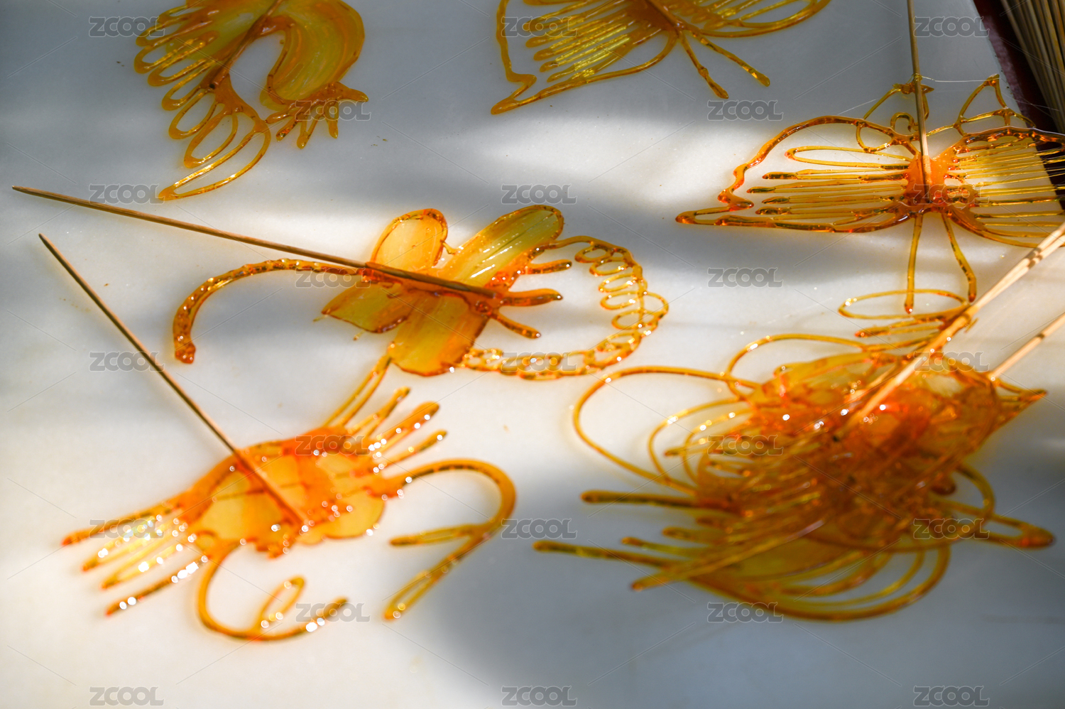 白色汉白玉石板上用黄色糖汁制作的中国民间传统糖画