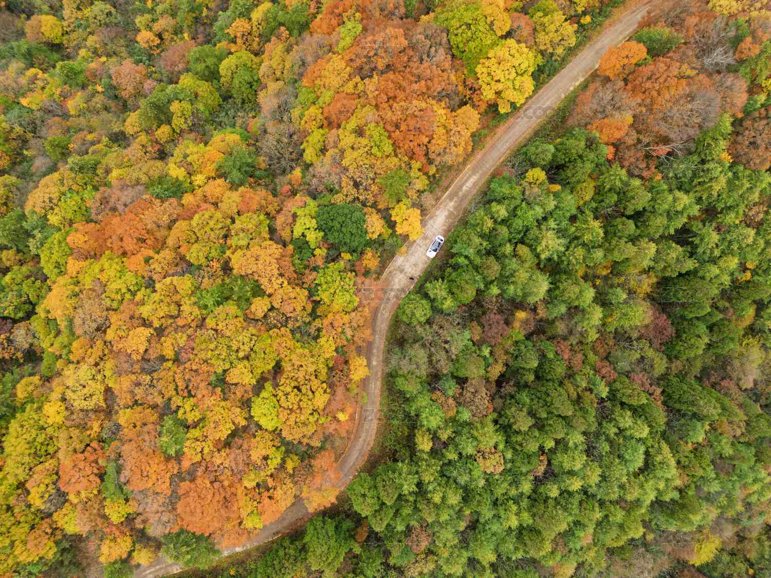俯瞰东北秋天五彩缤纷森林弯沿公路