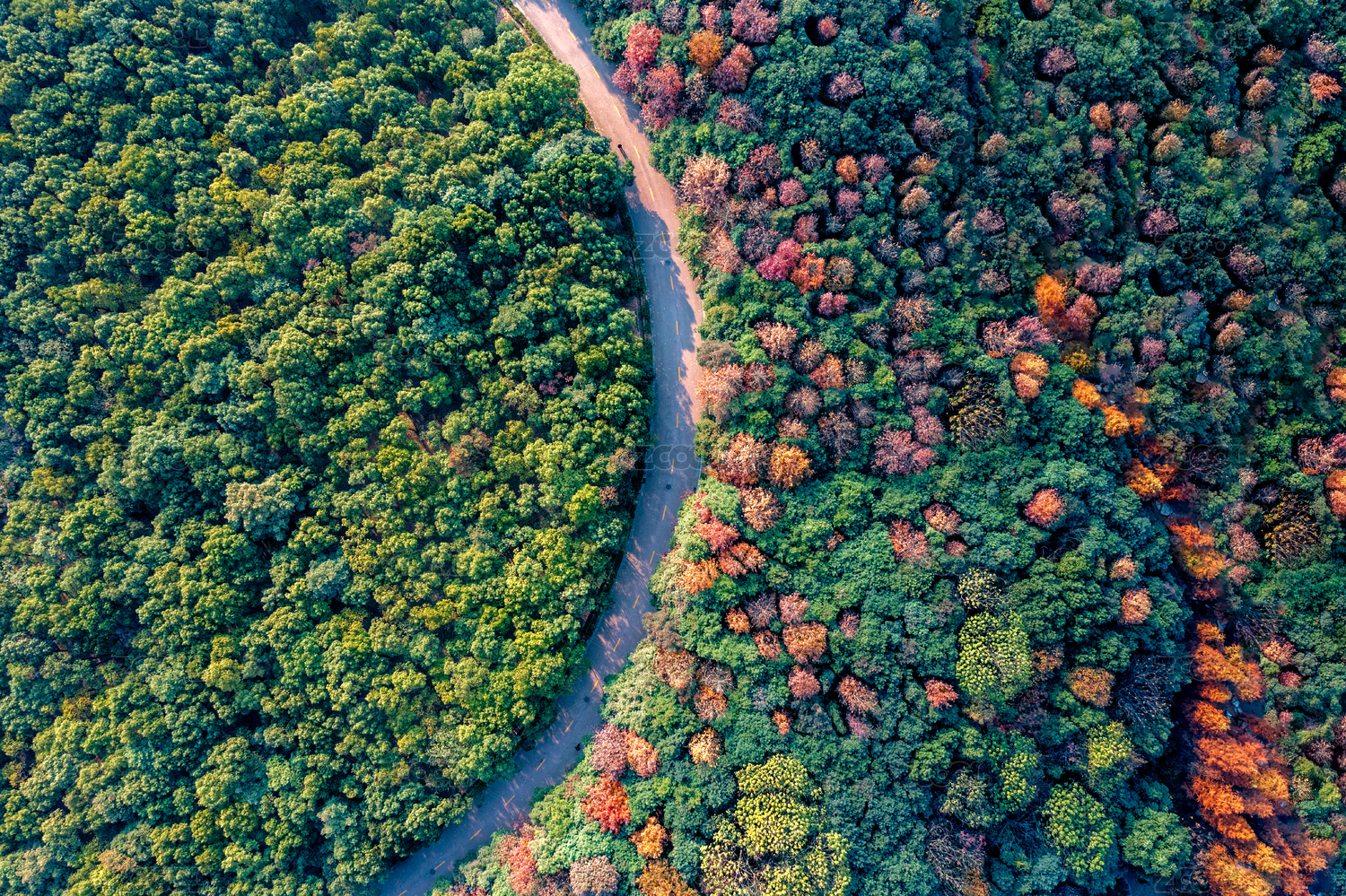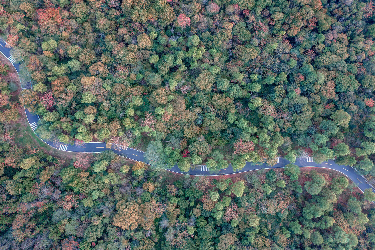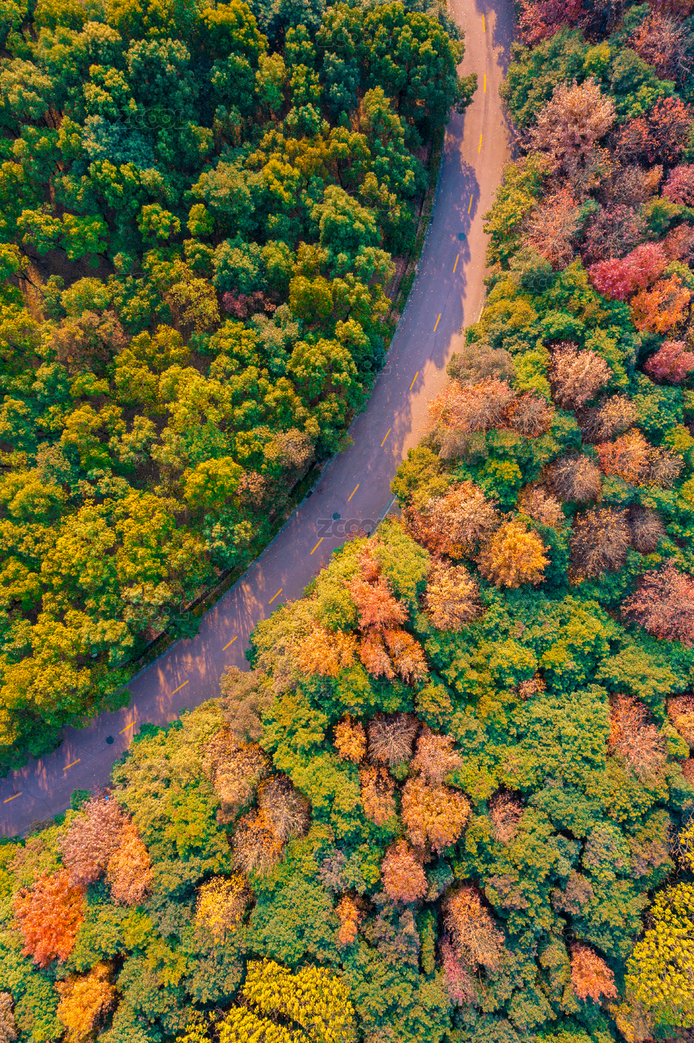 俯视江苏南京穿过五彩斑斓森林蜿蜒的公路