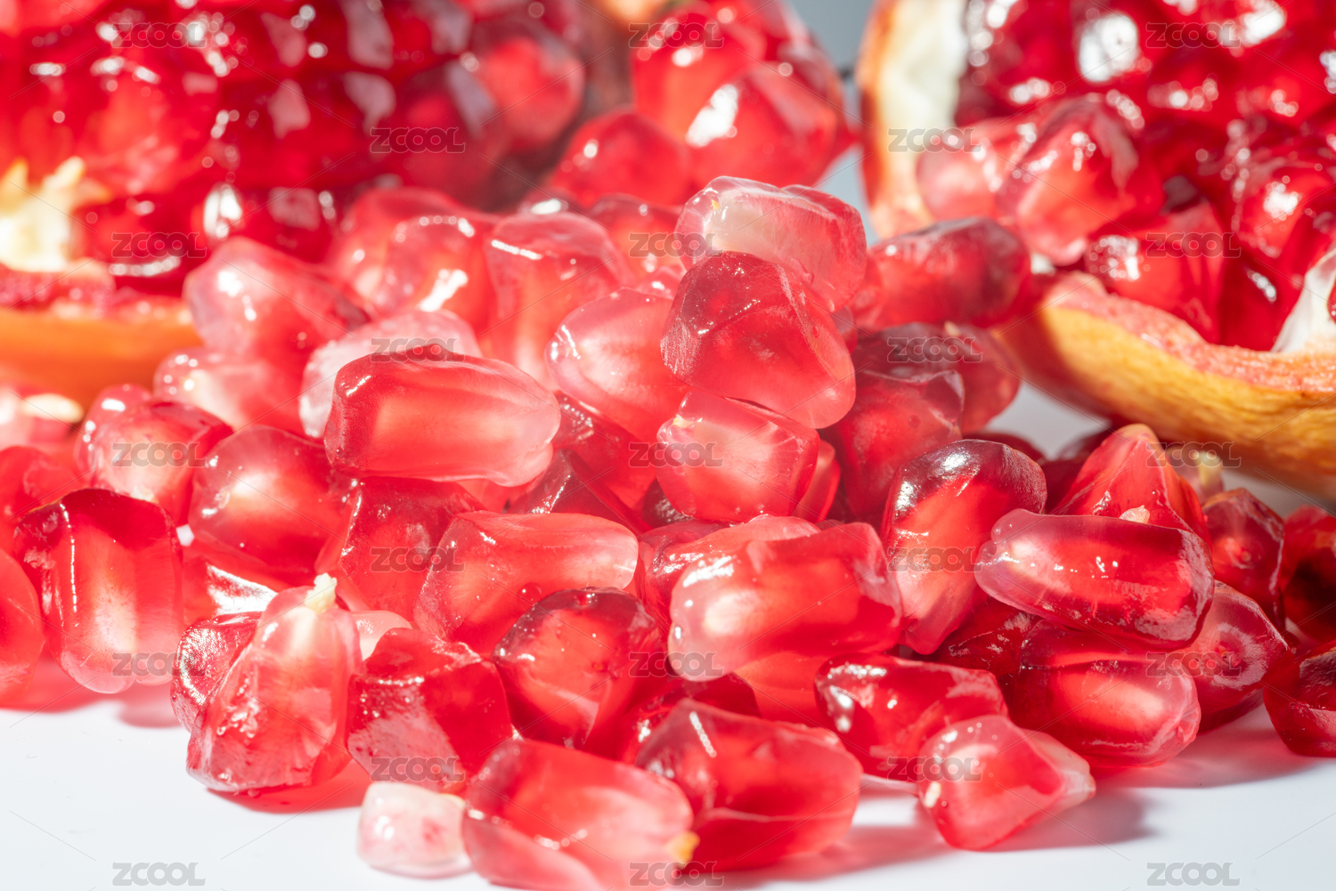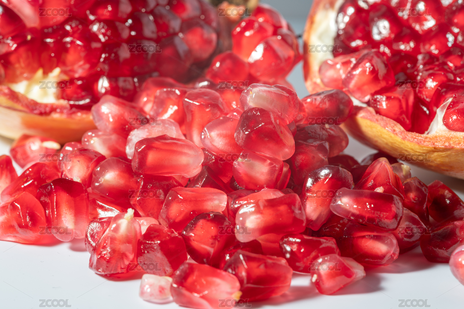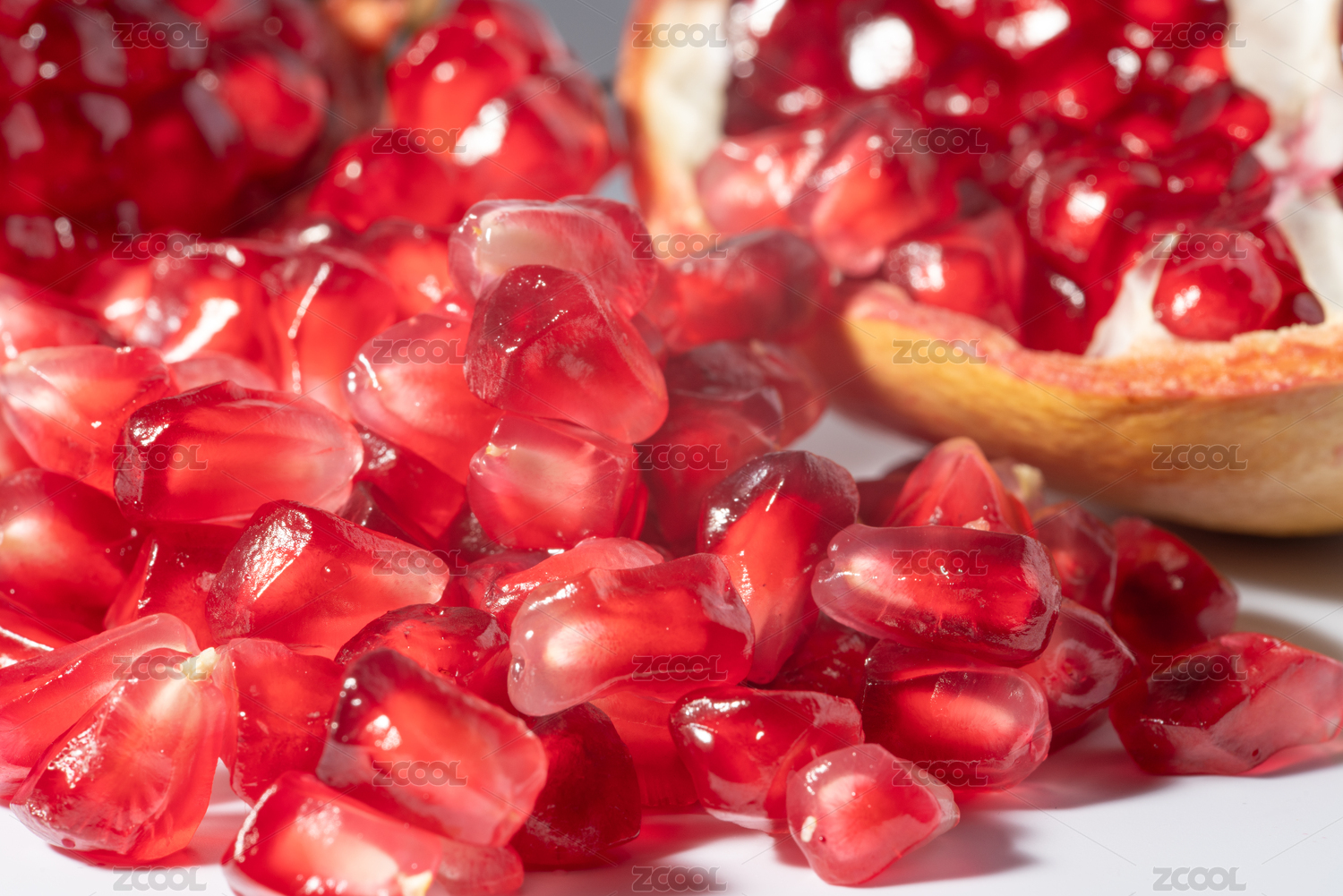白色背景里的剥开的石榴和一粒粒的石榴籽