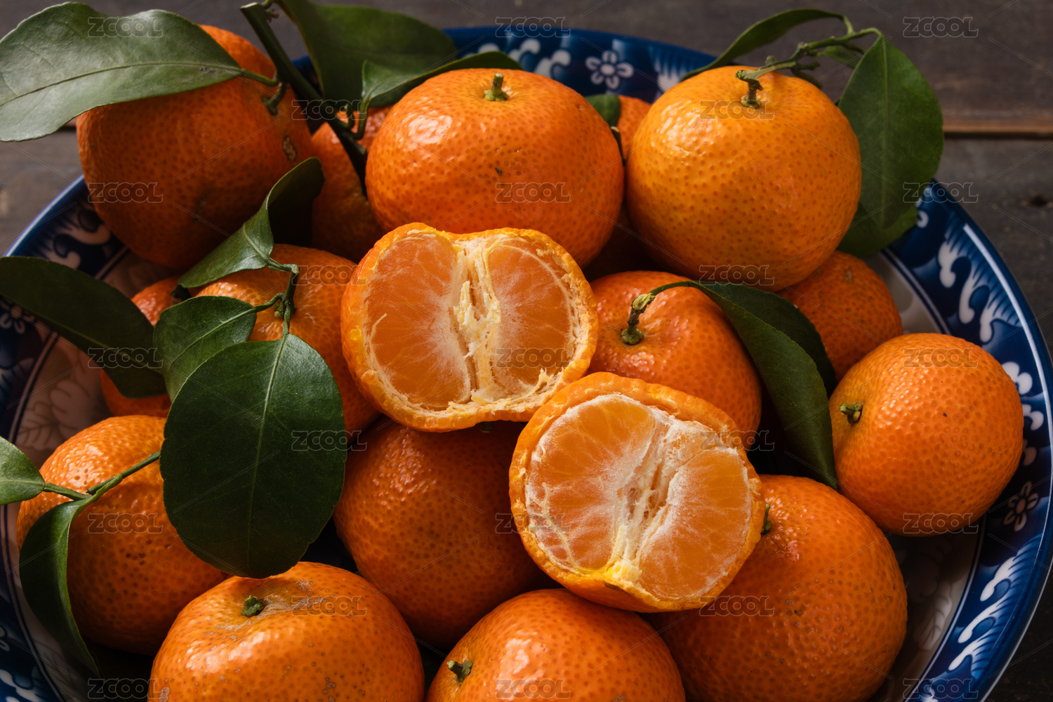 黑底上放着一个完整的砂糖橘和一个削皮蜜桔