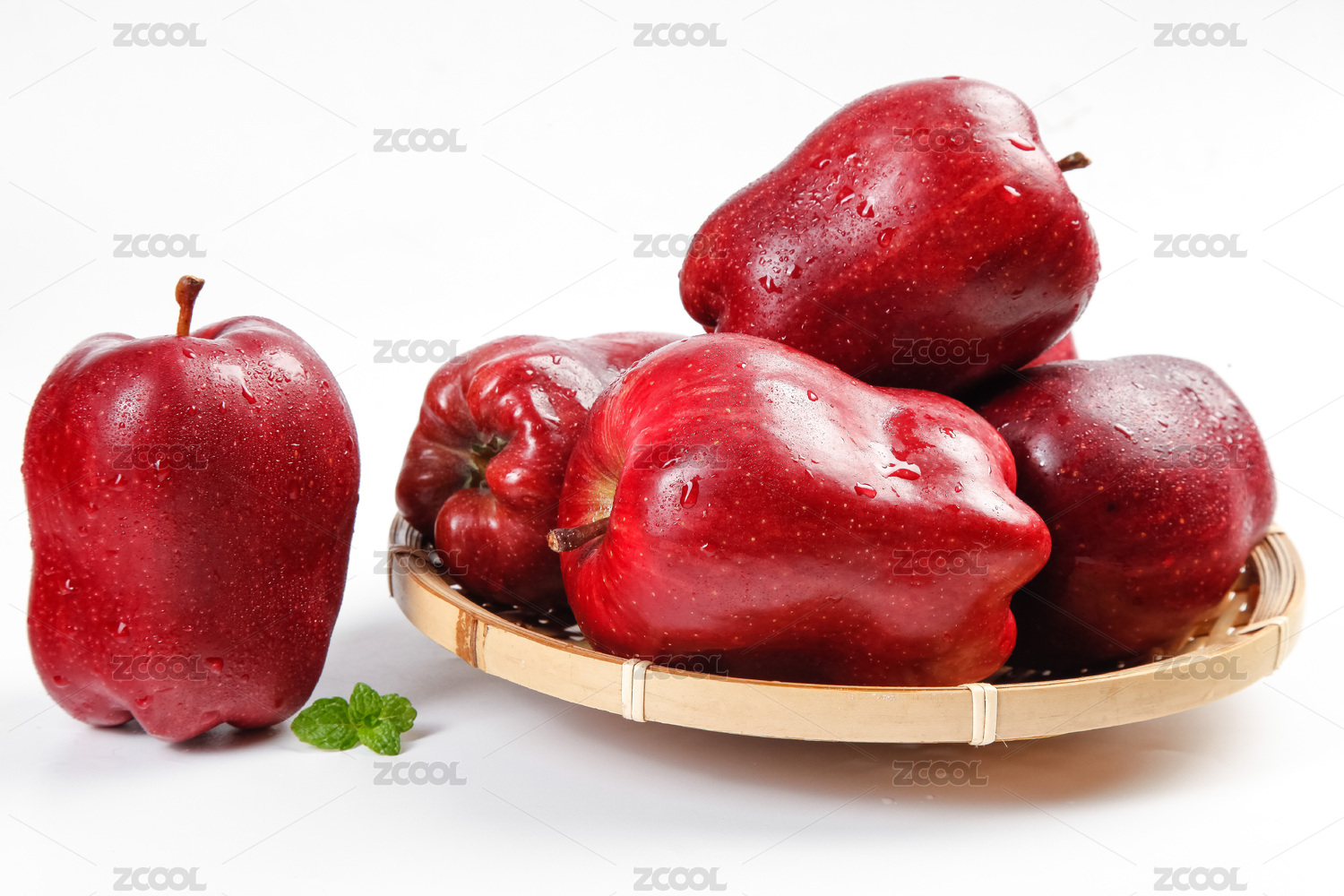 一堆苹果在竹盘上的白底