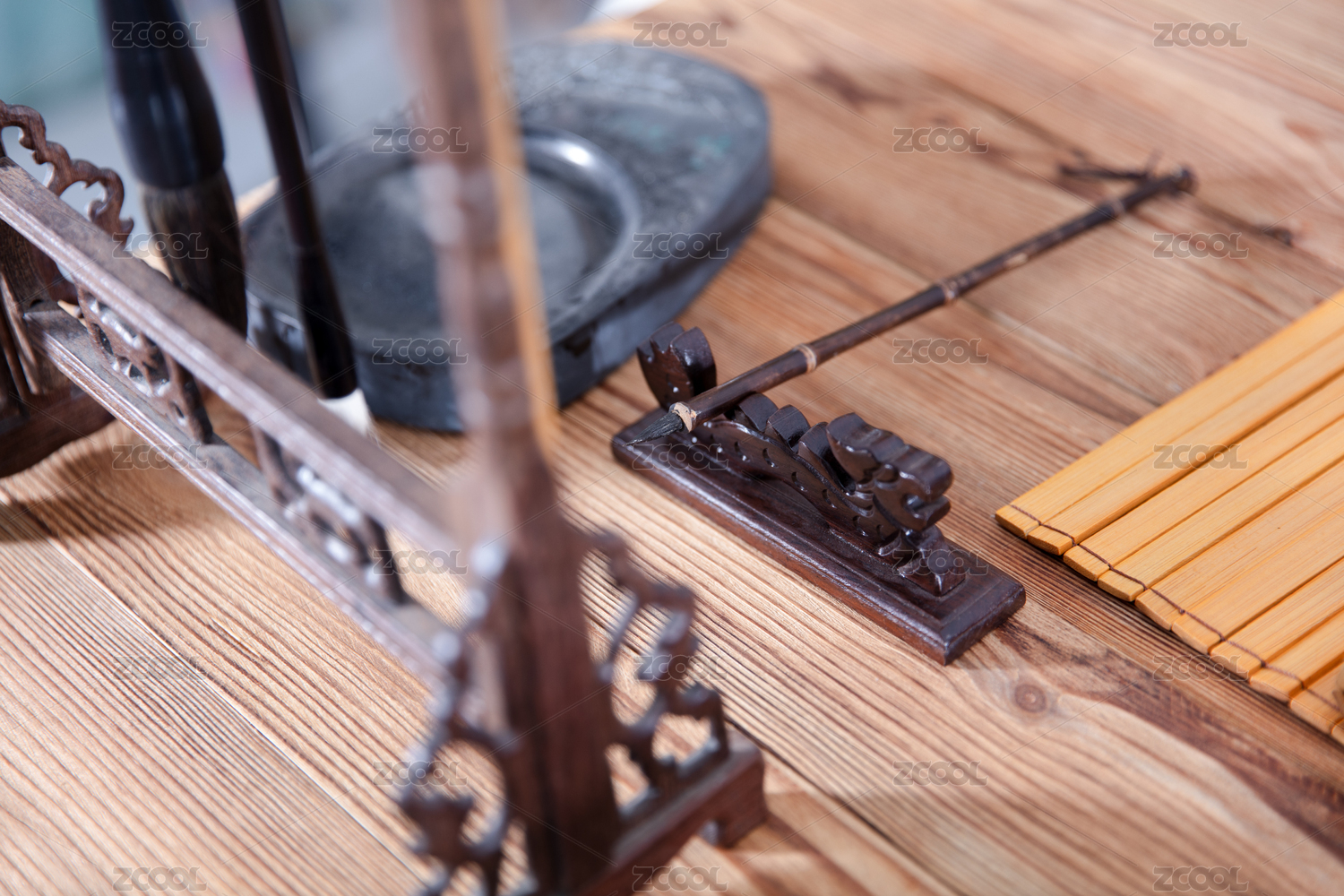 放在桌子上的中国传统乐器中阮的汉官帽琴头