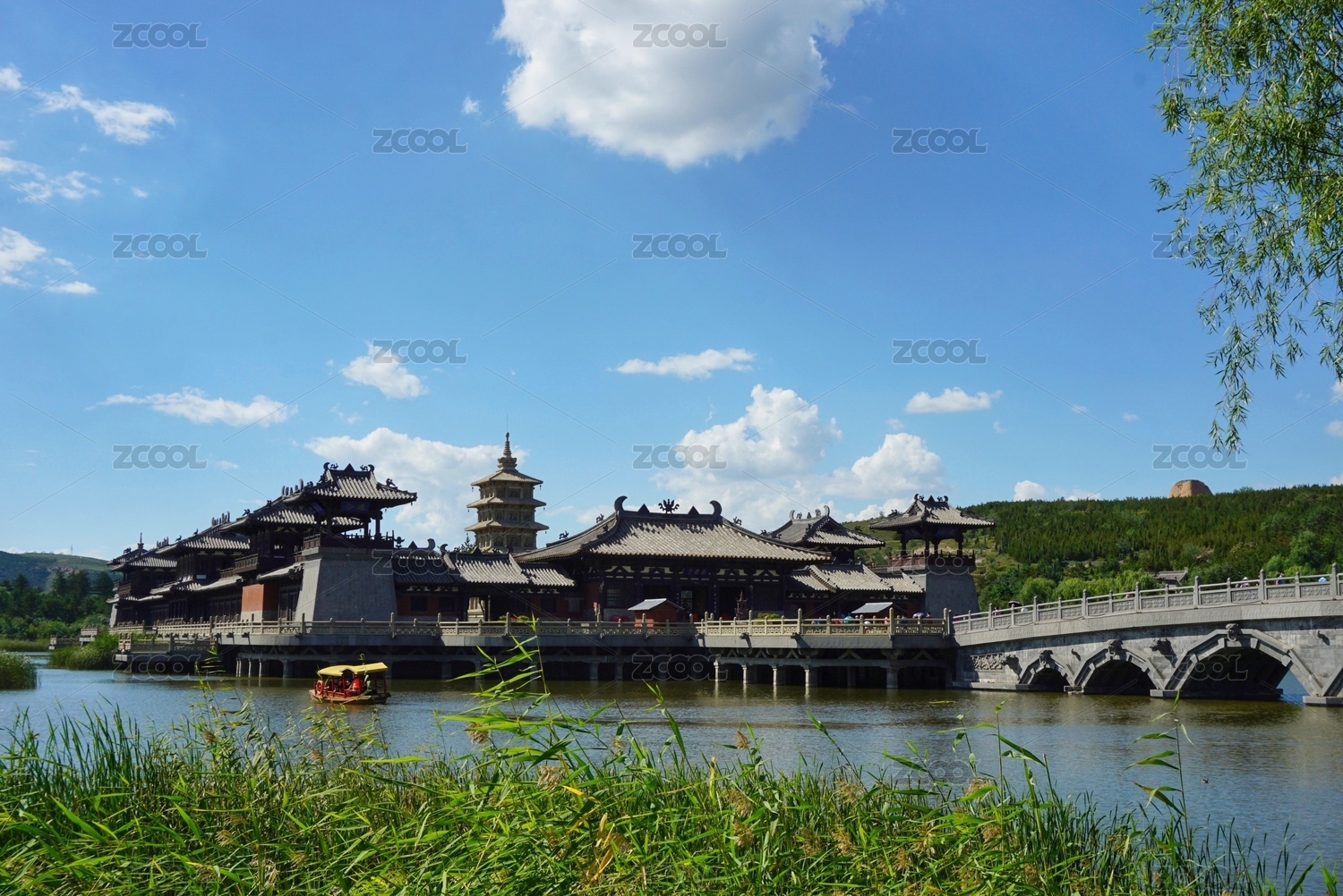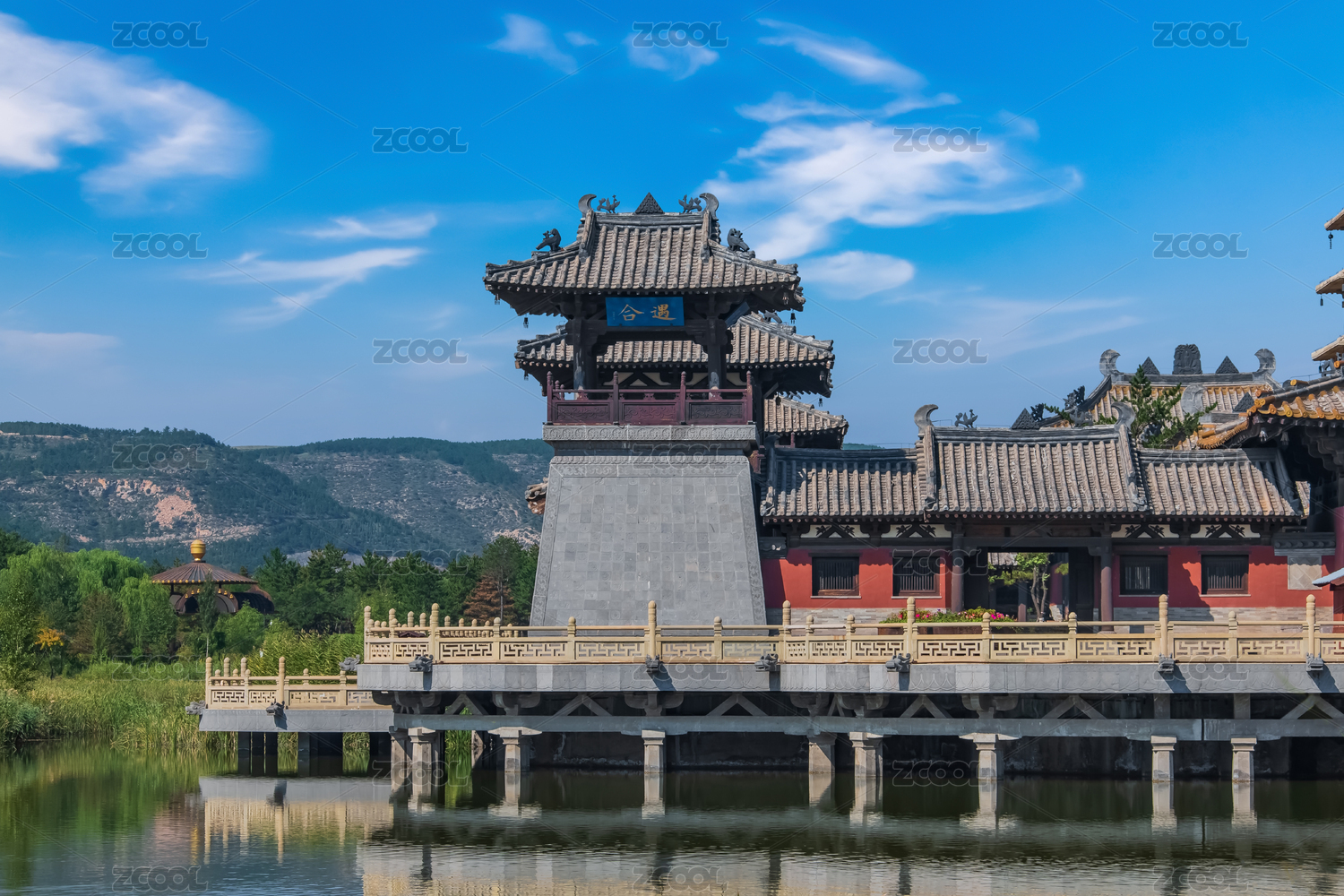 中国山西大同云冈石窟景区灵岩寺石桥倒影风光