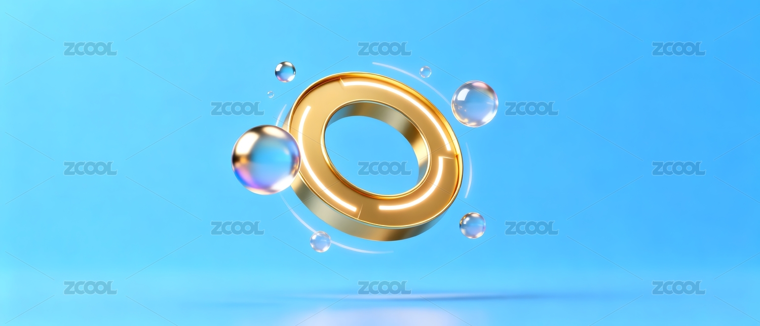 金色圆环与透明气泡环绕漂浮