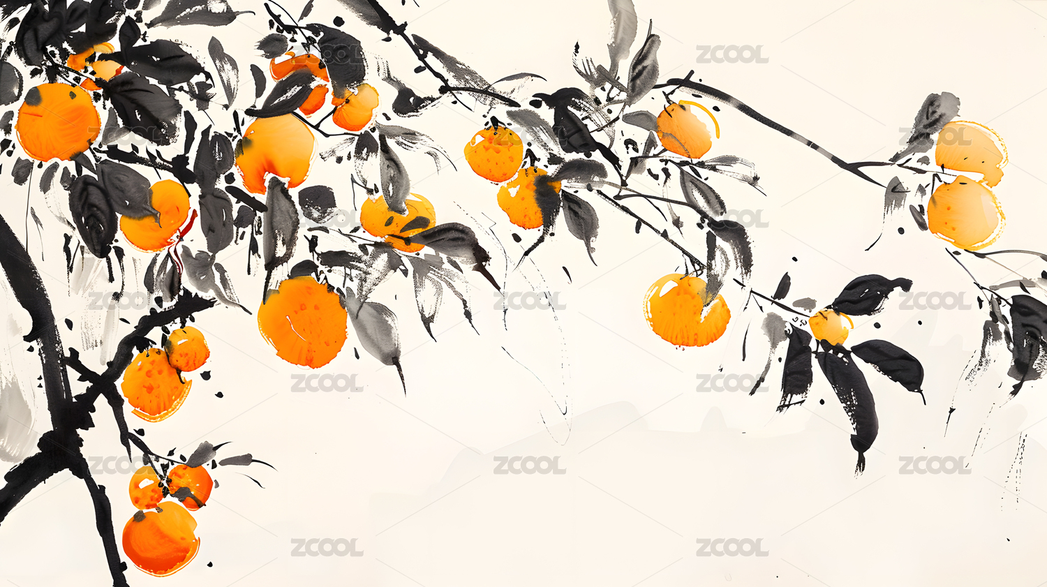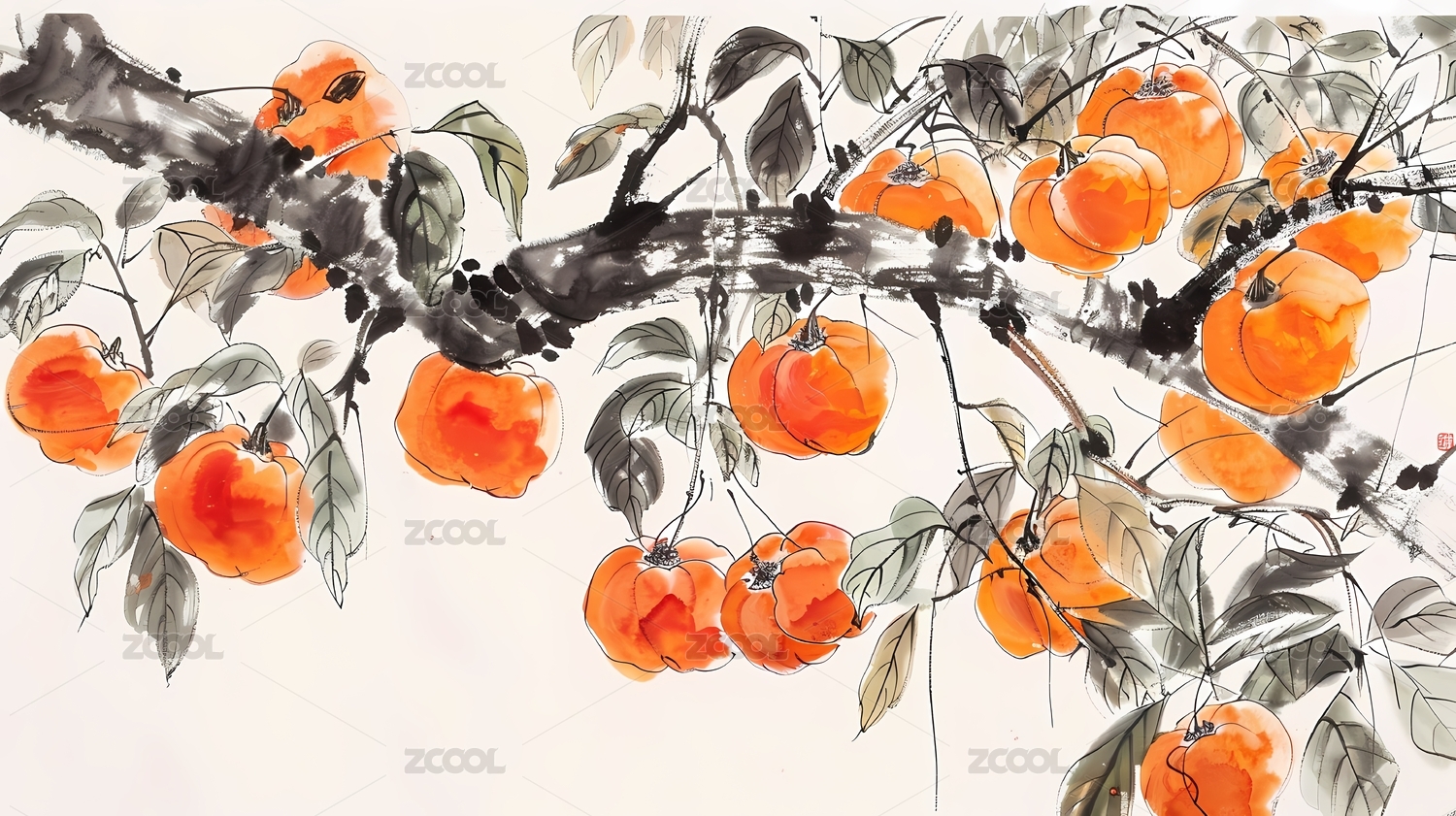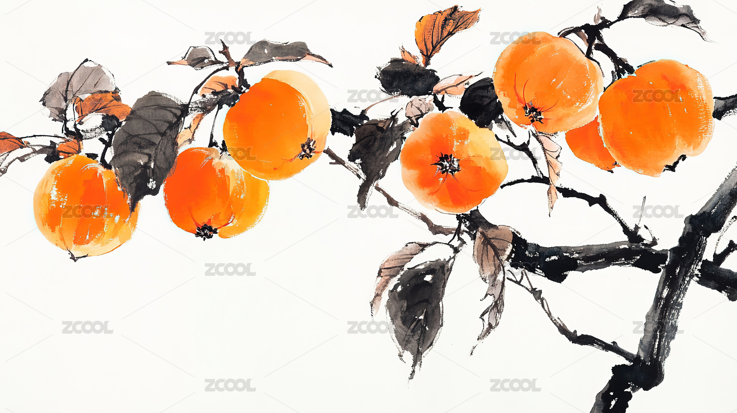 主视觉,商业,壁纸,水墨,柿子,传统,艺术,场景,国画,果实