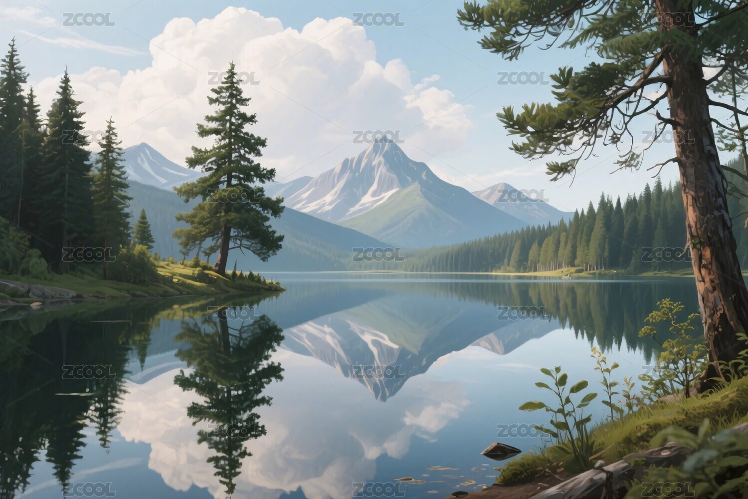 山水,湖泊,树林,山脉,湖水,森林,风景,插画,宁静,山水画