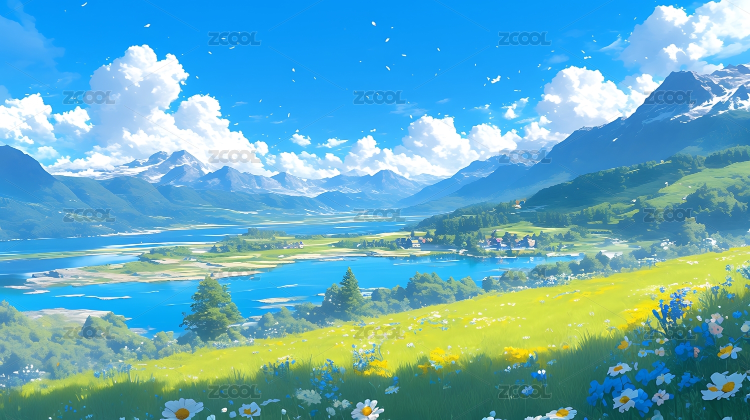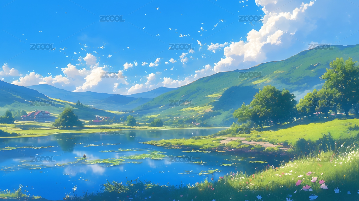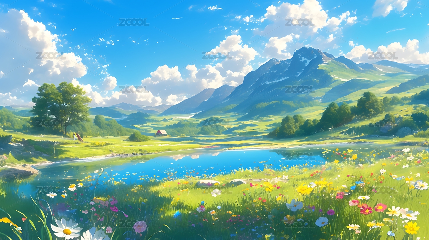 山水,湖泊,山脉,树木,花草,阳光,风景,自然,插画,山水画