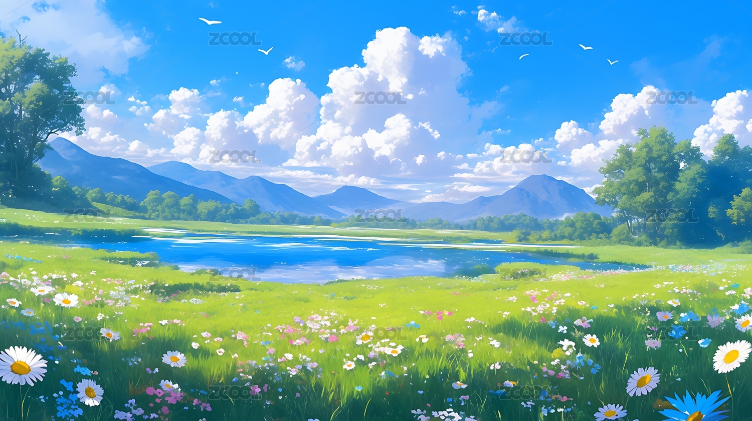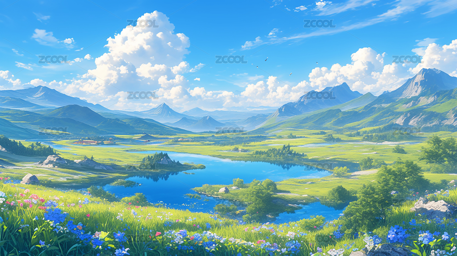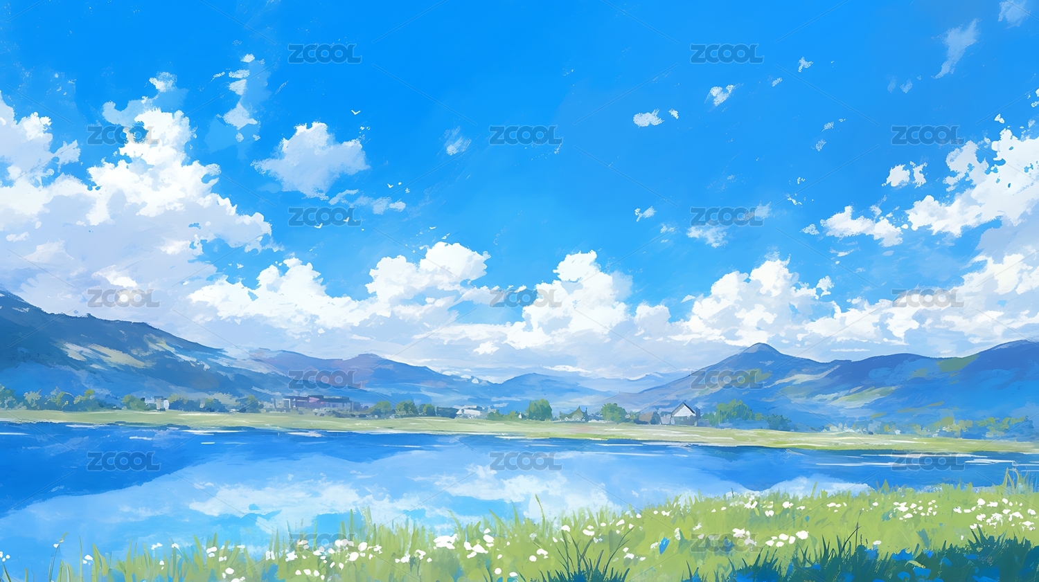 山水,湖泊,山脉,树木,花草,阳光,风景,自然,插画,山水画