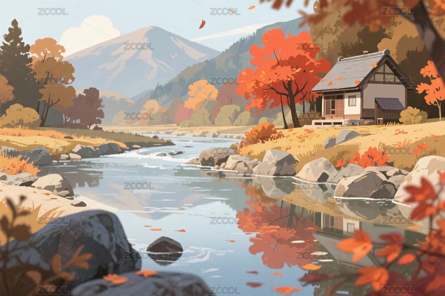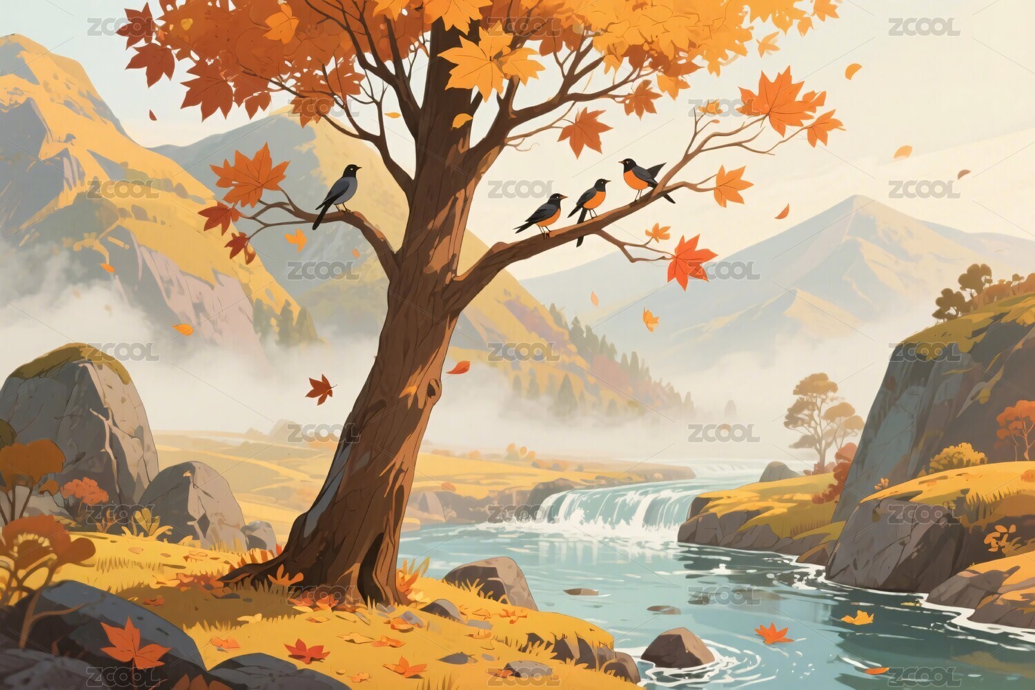 山水,河流,瀑布,秋叶,树木,溪流,自然,风景,插画,卡通