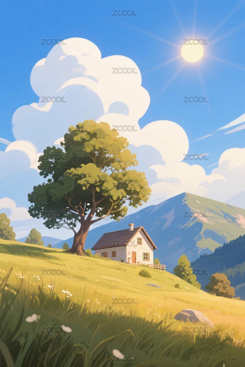 天空,太阳,山脉,树木,草地,鲜花,花朵,田园,风景,插画