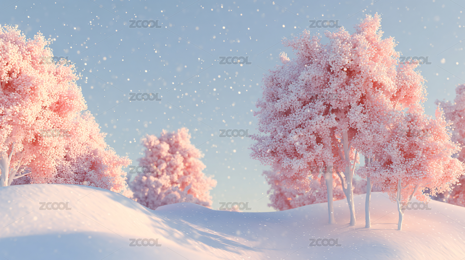 粉树,雪地,飘雪,梦幻,冬日,场景,雪景,树林,粉色,唯美