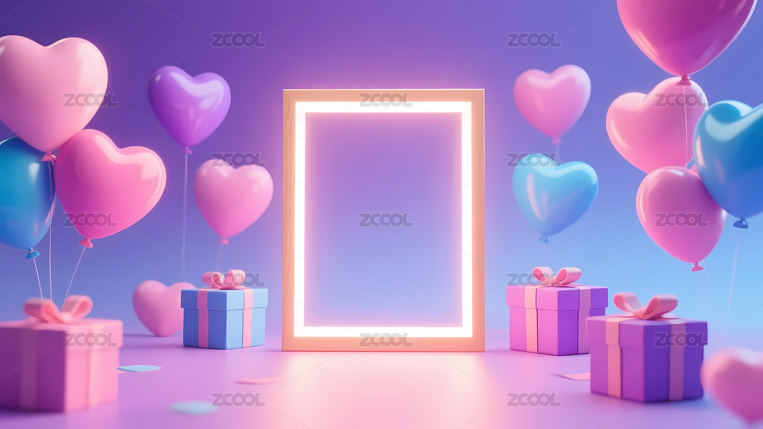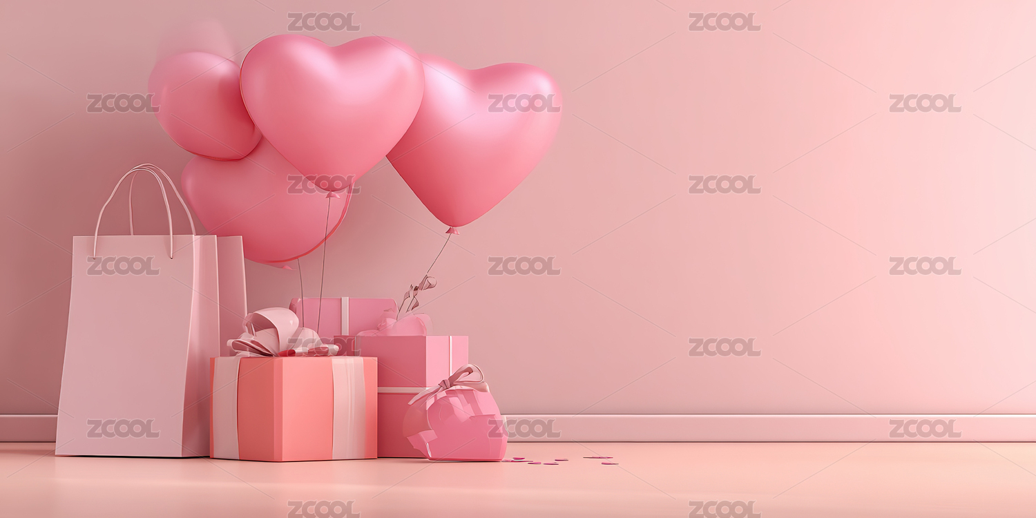 粉色心形气球与礼盒装饰场景