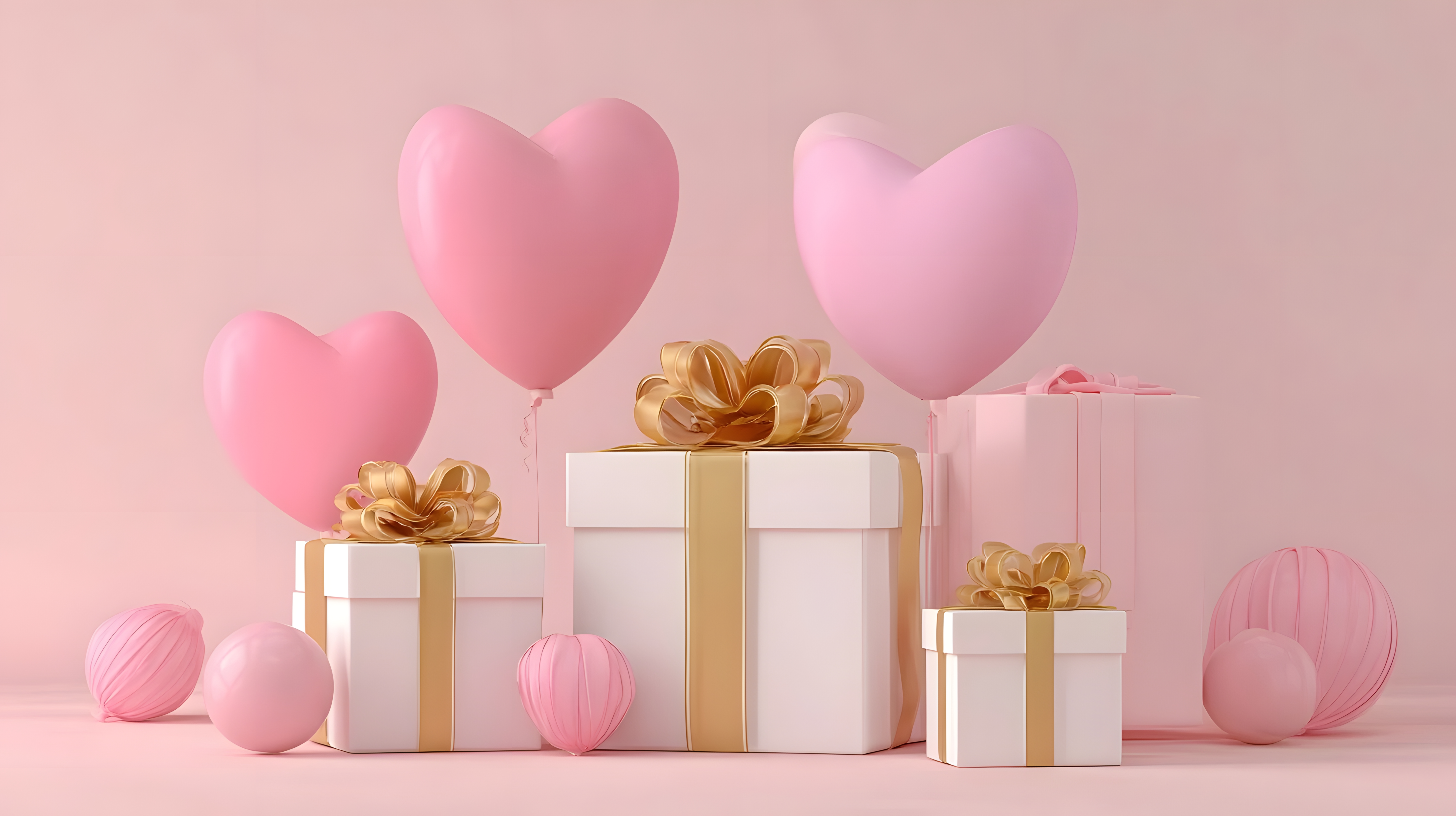 粉色心形气球与礼物盒的温馨场景