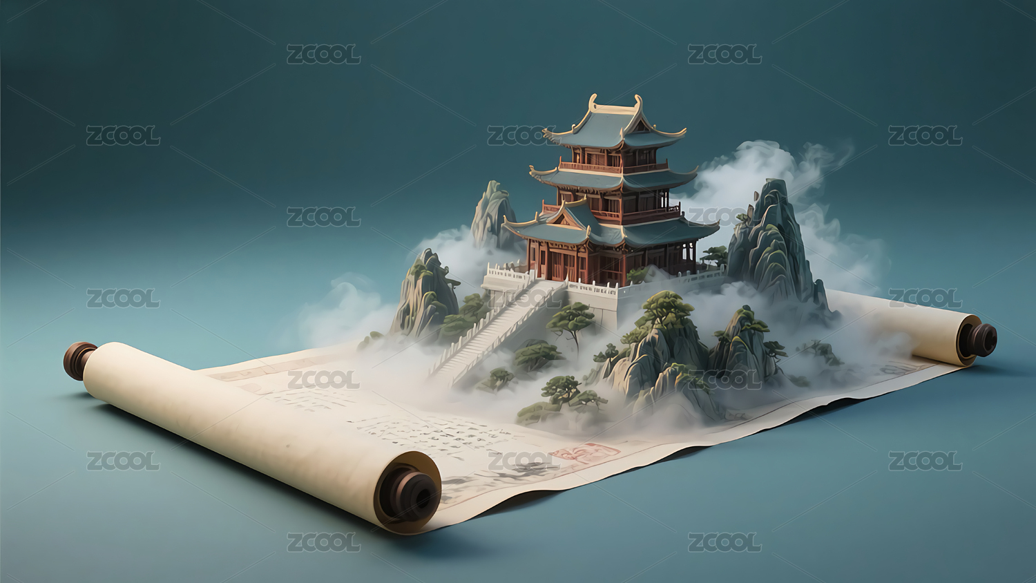 3D立体风格打开的书卷呈现出一副古风山水